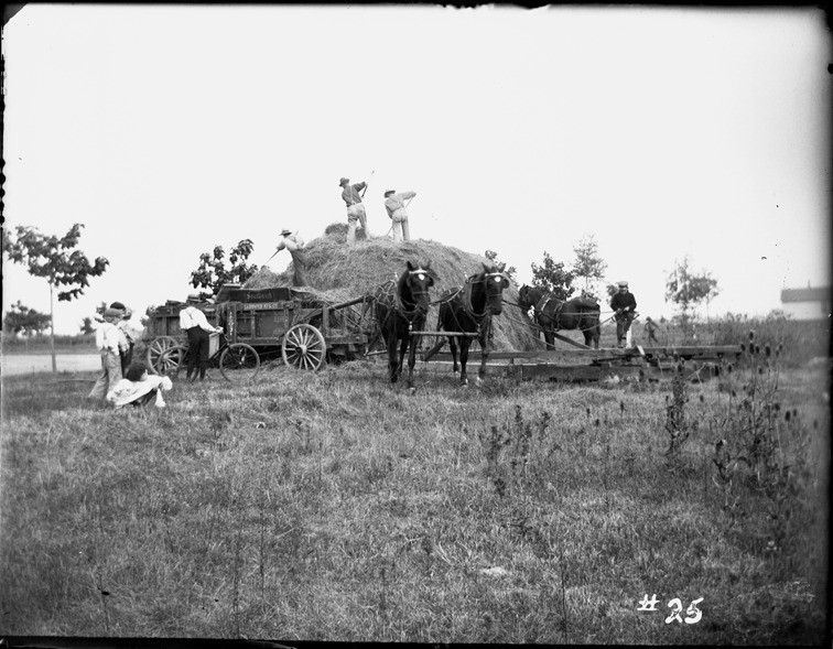 Men forking hay from pile into horse-powered hay press for baling. Group of children watching, one boy with bicycle. Press is powered by a team of horses turning capstan, driven by boy sitting at center point. Another team of horses by hay stack. Printed on press: "Southwick, Sandwich Mfg. Co." Written on negative: "#25." Recorded in glass negative ledger: "D/Parks-Palmer." Emulsion flaking on edges.