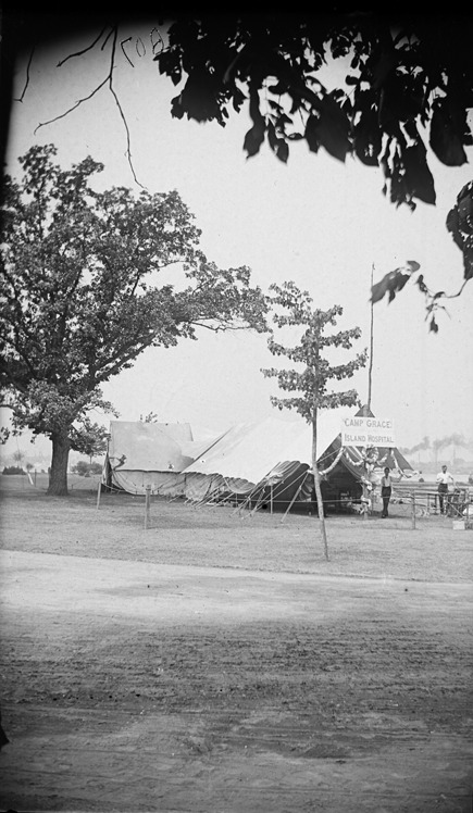 Two young men in shirtsleeves stand in front of two large tents next to piles of chairs. Banner across nearest tent reads: "Camp Grace, Island hospital." Multicolored wreath and roping decorate front tent pole. Written on negative (reversed in scan): "807." Recorded in glass negative ledger: "D/Conventions-G.A.R.-25th national encampment, Detroit, 1891." Emulsion flaking on edges.