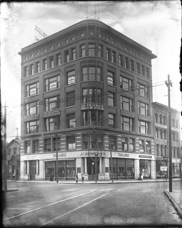 Six-story brick building with rounded corner windows, viewed at an angle across intersection. Signs include: Bamlet building; Morris Woolen Co.; Gutchess College of Business; State [?] Building Association of Indiana; The Prudential, insurance; Bamlet and Miller, real estate; J.C. Hasse & Son, tailors; Johnson & Foster, tobacco; Enterprise Shoe House; Howes & Mitchell; The Royal Hat Co. Recorded in glass negative ledger: "D/Buildings-Bamlet." Emulsion flaking on edges.