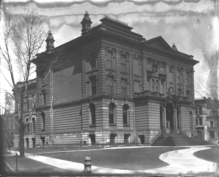 Old library building located on Gratiot Avenue between Library and Farmer Streets, viewed at an angle across curving sidewalks. Three-story Second Empire brick building, with arched windows, bust of unknown figure carved into front, and steps leading to pillared entranceway. Recorded in glass negative ledger: "D/Libraries-Detroit Public Library." Emulsion discolored and lifting on edges, with some flaking.