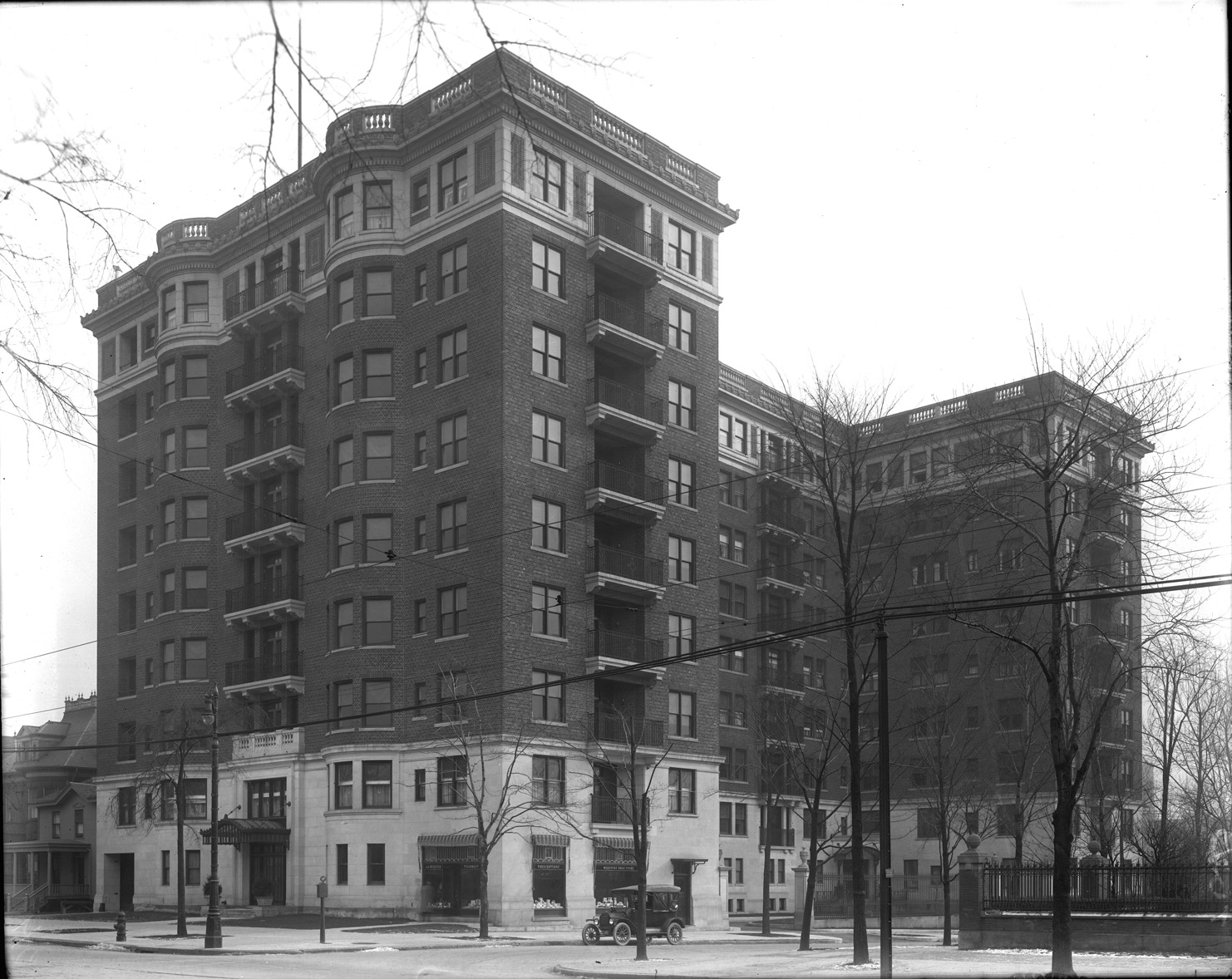 Nine-story brick apartment building with balconies, circle drive, and balustraded roof. Webster Drug Store in ground floor on corner. Car parked by store. Garden Court Apartments at 872-4 Jefferson and Webster Drugs at 866 in 1915 Detroit City Directory. Recorded in glass negative ledger: "D/Apartment houses-Garden Court."