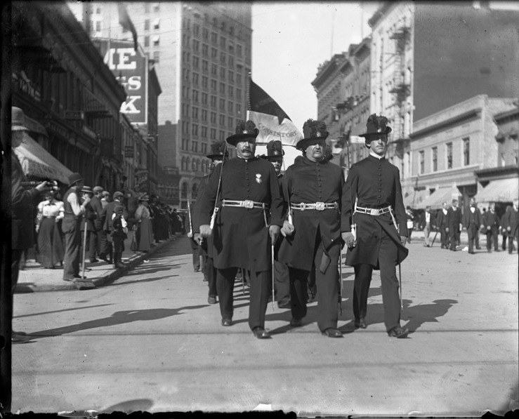 Men in uniform frock coats with swords and cavalry hats decorated with ostrich feathers march on street. Sign partially visible: Home Savings Bank. Crowd watches from sidewalks. Recorded in glass negative ledger: "D/Organizations-Freemasons, Syria Temple Shriners, 1897." Emulsion flaking on edges.