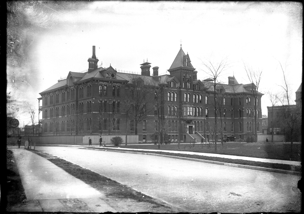 Brick Second Empire building, viewed at an angle from next block over side street and intersection. Architectural details include round-topped windows, dormers, square central tower, and metal ornamentation on ridgeline. Men walking on sidewalk in front, and horse-drawn carriage near entrance. Recorded in glass negative ledger: "D/Hospitals-St. Mary's." Emulsion lifting and flaking on edges.