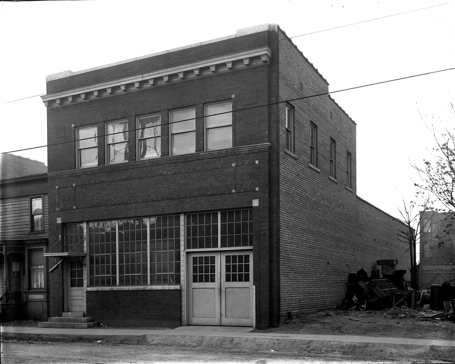 View of the Johnson-Larsen Co. office and warehouse, located at 12 Griswold St. The 1913 city directory lists the company under heating and ventilation engineers. Two-story brick storefront building, viewed at an angle from unpaved street. Recorded in glass negative ledger: "D/Industries and business houses--Johnson & Larsen, office and warehouse."