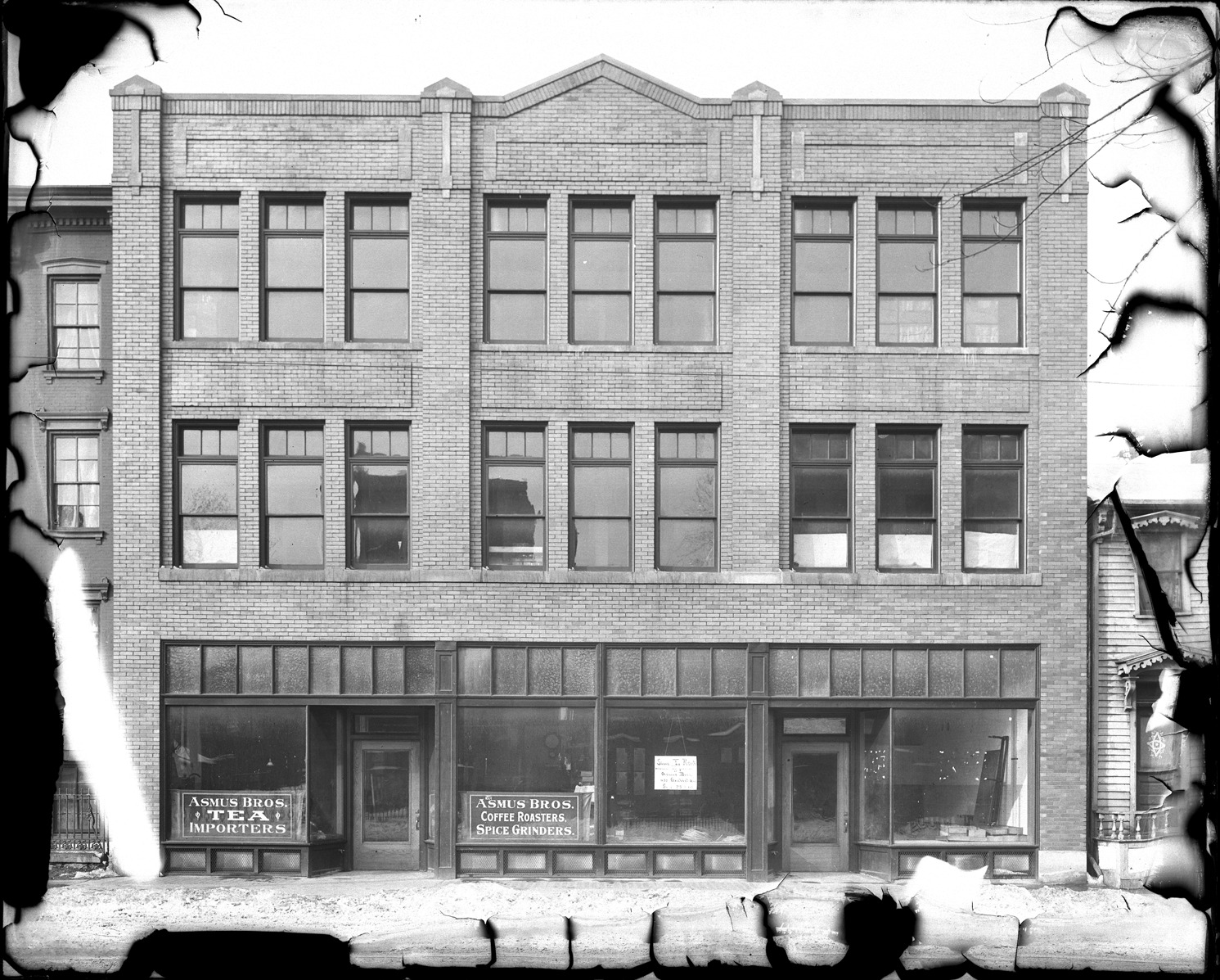 Three-story brick storefront building, viewed head-on from the street. Signs in windows read: "Asmus Bros., tea importers"; "Asmus Bros., coffee roasters, spice grinders." Brick and clapboard buildings abut. Recorded in glass negative ledger: "D/Industries & business houses-Asmus Bros." Emulsion cracked, lifting, and flaking on edges.