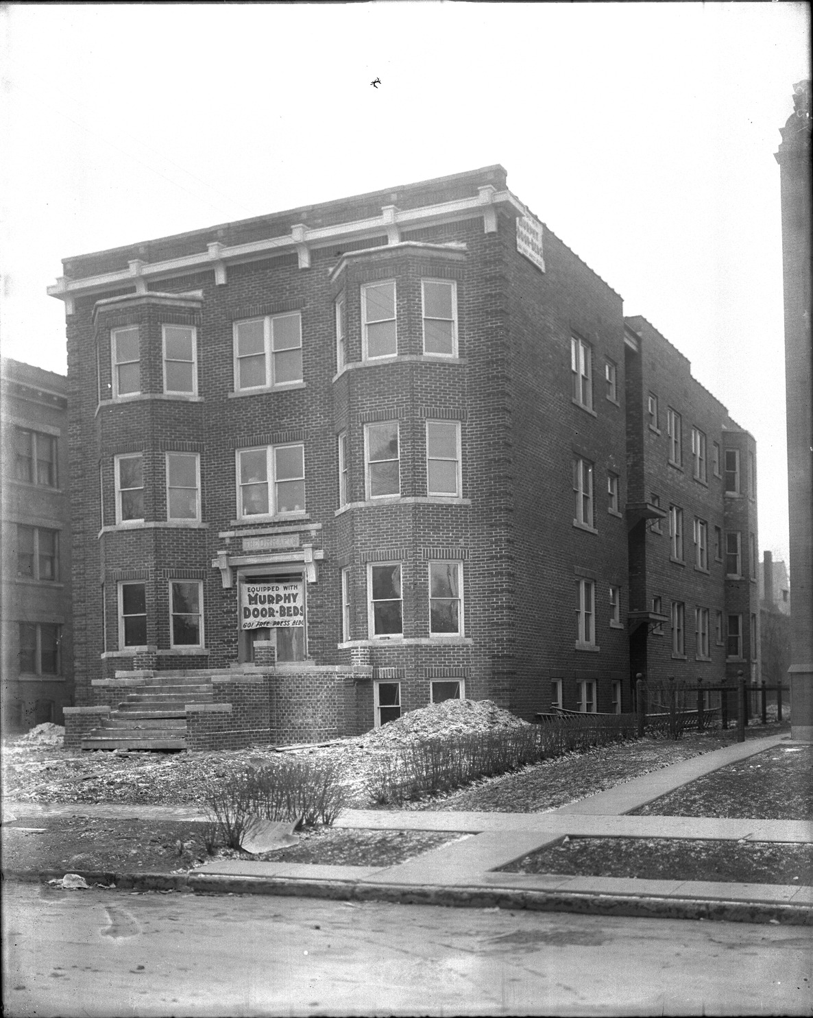 View of multistory brick apartment building with front bay windows; inscribed over entrance: "The Orr apts." Banner covering front entrance reads: "Equipped with Murphy door-beds, 601 Free Press building." Recorded in glass negative ledger: "D/Apartment houses-Orr."