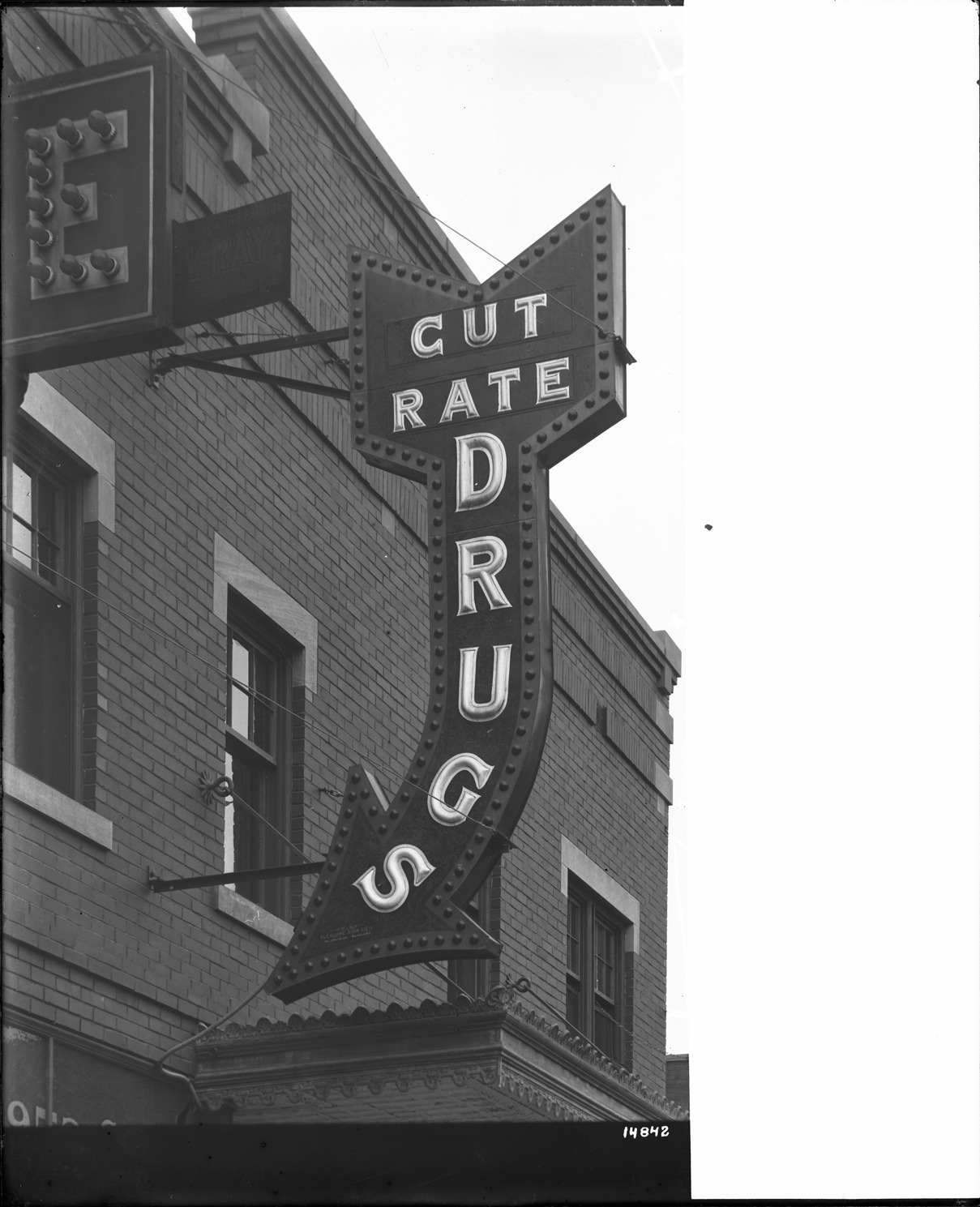 Favorite this☆ Building sign Description: View of electric sign on brick building; sign is shaped like an arrow; sign reads: "Cut rate drugs." Recorded in glass negative ledger: "D/Signs & signboards-Paul Ruhter drug store, cut rate drugs." Details Resource ID: EB02f887 Subject: Signs and signboards--Michigan--Detroit Drugstores--Michigan--Detroit Glass negatives Date Issued: Unknown year Format: 1 negative : glass ; 10 x 8 in. Member of: Burton Historical Collection Negative Number: BHC glass neg. no. 3987 Rights: Physical rights are retained by DPL. Copyright is retained in accordance with U.S. copyright laws.