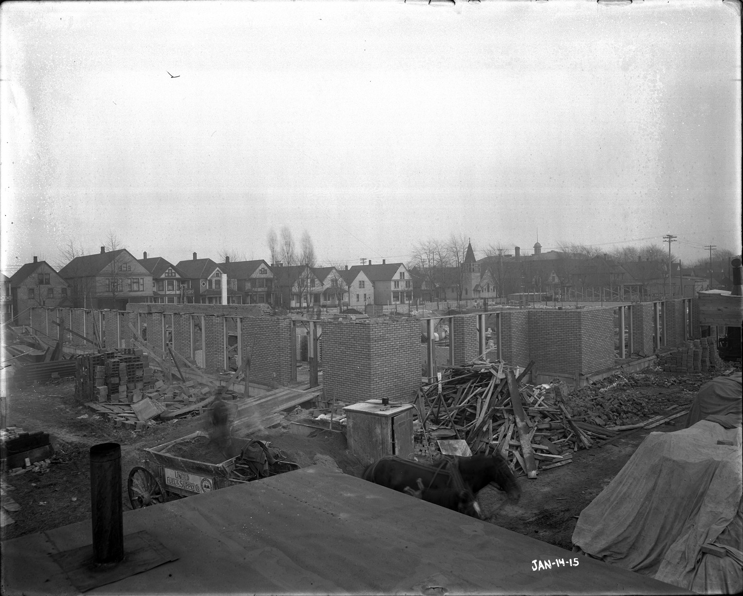 View of Eastern High School under construction; brick walls on lower level partially completed; construction debris on site; horse-drawn wagon in foreground. Written on image: "Jan-14-15." Recorded in glass negative ledger: "D/Schools-Eastern High, under construction."