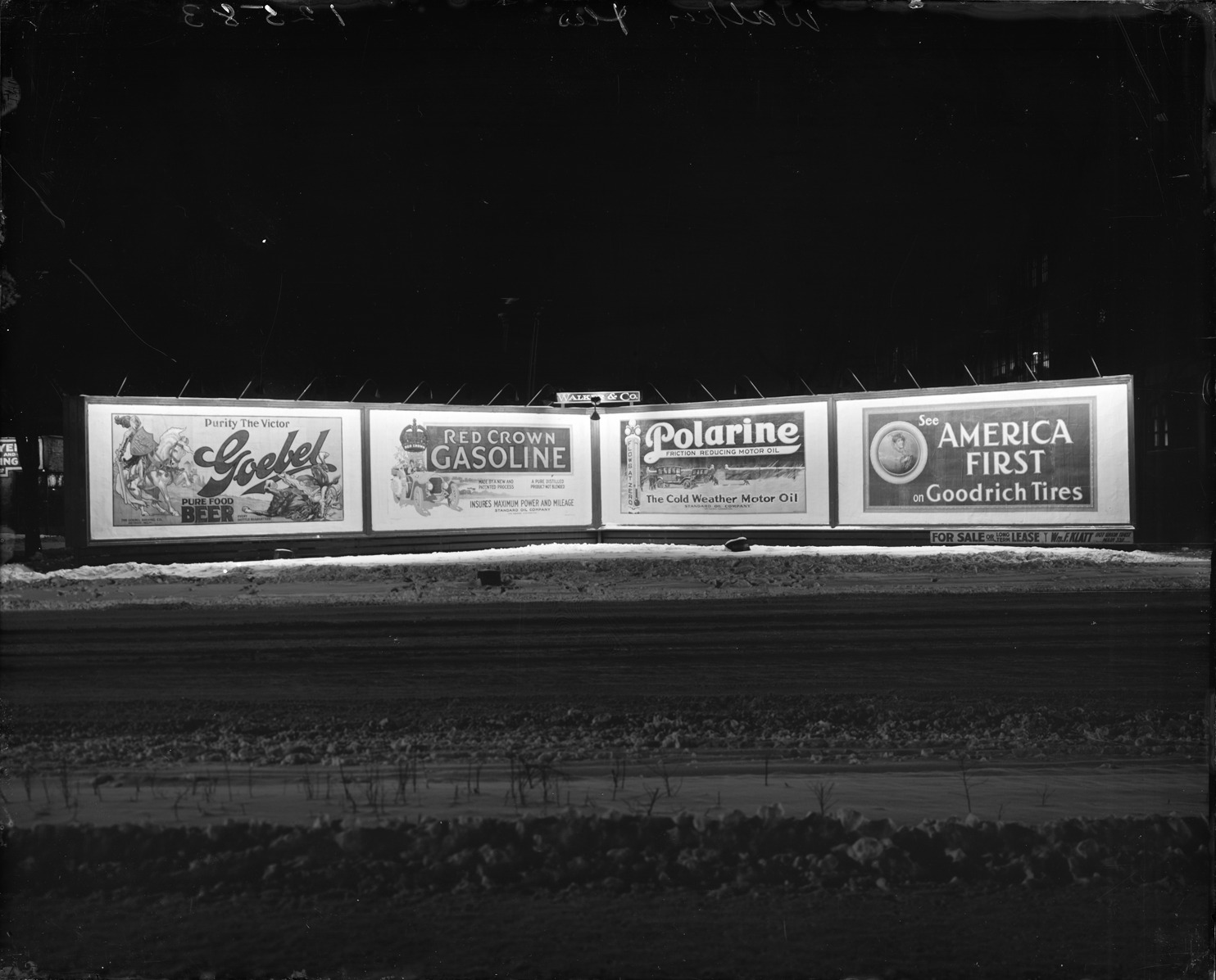 View of four illuminated billboards at night; text on billboards: "Purity the victor, Goebel pure food beer; Red Crown gasoline made by a new and patented process, a pure distilled product, not blended, insures maximum power and mileage, Standard Oil Company; Polarine friction reducing motor oil, the cold weather motor oil, Standard Oil Company; see American first in Goodrich tires." Recorded in glass negative ledger: "D/Signs & signboards."