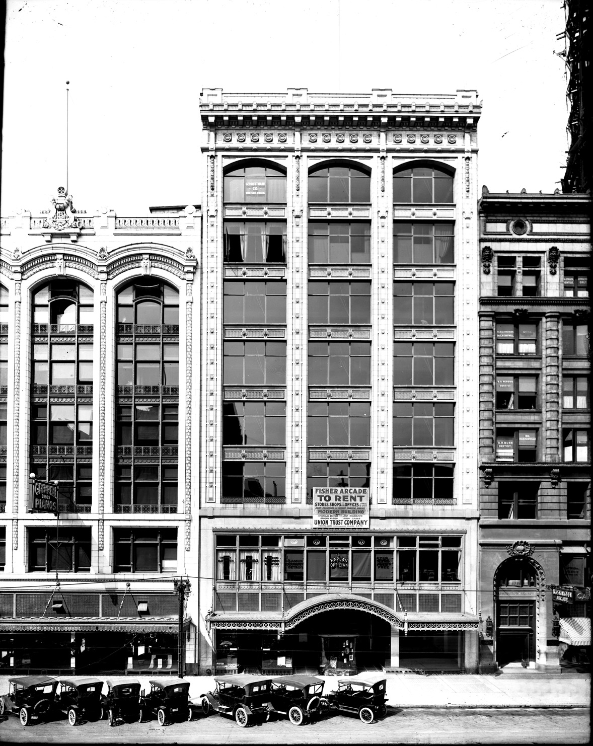 View of multistory commercial building with rounded arch awning over entrance; L. Kaplan optician on second level; sign on building: "Fisher Arcade to rent, stores, shops and offices, space to rent, modern building, Union Trust Company." Row of automobiles parked in street. Recorded in glass negative ledger: "D/Buildings-Fisher Arcade."