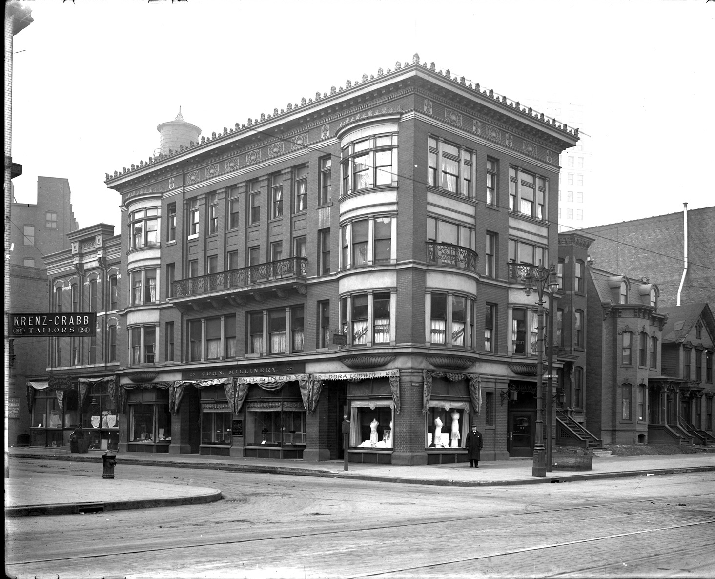 View of multistory brick commercial building with ornate details near roof line; bay windows and decorative metal balconies; storefront on lower level displays dressmaker's forms; sign over storefront: "Cohn Millinery." Man stands on corner. Visible on opposite corner is sign for Krenz Crabb tailors. Recorded in glass negative ledger: "D/Streets-John R."