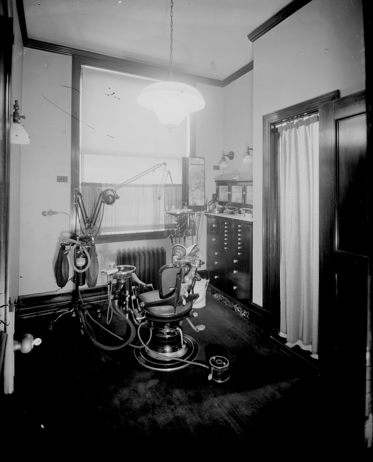 Favorite this☆ Simmons and Meier dental office Description: View of dentist's chair and drill in dental office; cabinet with supplies against wall. Recorded in glass negative ledger: "D/Dentists-Simons [sic] & Meier (Maier)." 1915 City Directory lists Robert C. Simmons and William J. Meier, dentists. Details Resource ID: EB02f909 Subject: Dental offices--Michigan--Detroit Dental drilling--Michigan--Detroit Dental instruments and apparatus--Michigan--Detroit Glass negatives Date Issued: Unknown year Format: 1 negative : glass ; 10 x 8 in. Member of: Burton Historical Collection Negative Number: BHC glass neg. no. 4023 Rights: Physical rights are retained by DPL. Copyright is retained in accordance with U.S. copyright laws.