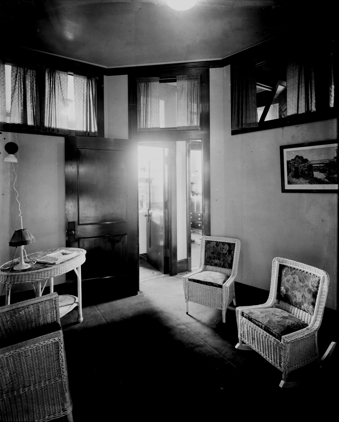 Favorite this☆ Simmons and Meier dental office waiting room Description: View of waiting room in dental office; wicker table and chairs. Recorded in glass negative ledger: "D/Dentists-Simons [sic] & Meier (Maier)." 1915 City Directory lists Robert C. Simmons and William J. Meier, dentists. Details Resource ID: EB02f910 Subject: Dental offices--Michigan--Detroit Waiting rooms--Michigan--Detroit Glass negatives Date Issued: Unknown year Format: 1 negative : glass ; 10 x 8 in. Member of: Burton Historical Collection Negative Number: BHC glass neg. no. 4024 Rights: Physical rights are retained by DPL. Copyright is retained in accordance with U.S. copyright laws.