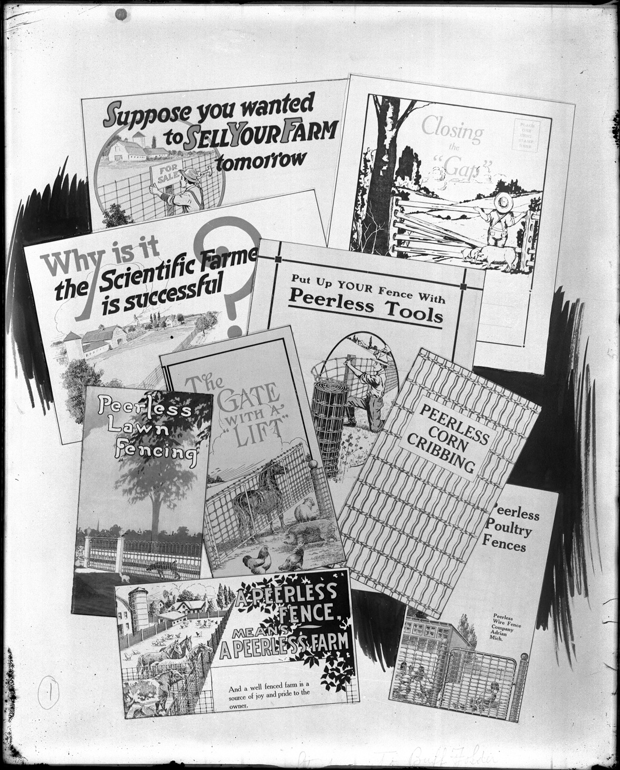 Favorite this☆ Peerless Wire Fence Company brochures Description: Drawing of a selection of brochures from Peerless Wire Fence Co. Recorded in glass negative ledger: "D/Signs and signboards, booklets of Peerless Wire Fence Co." Details Resource ID: EB02f930 Subject: Commercial catalogs--Michigan--Detroit Advertising--Michigan--Detroit Fence industry--Michigan--Detroit Glass negatives Date Issued: Unknown year Format: 1 negative : glass ; 10 x 8 in. Member of: Burton Historical Collection Negative Number: BHC glass neg. no. 4055 Rights: Physical rights are retained by DPL. Copyright is retained in accordance with U.S. copyright laws.
