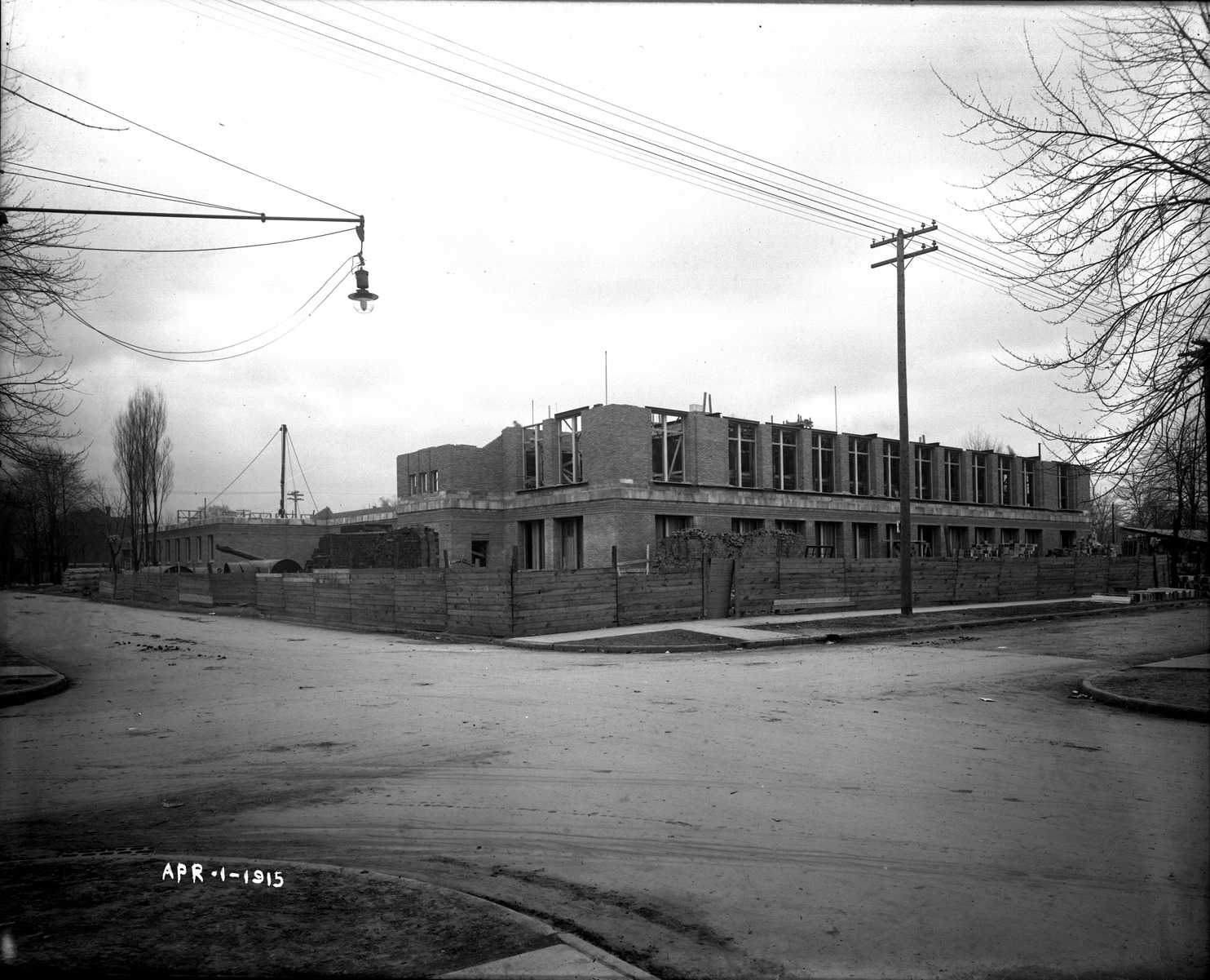 View of Northeastern High School under construction; brick walls partially completed; wooden fence surrounds construction site. Written on image: "Apr-1-1915." Recorded in glass negative ledger: "D/Schools-Northeastern High, construction, Apr. 1, 1915."