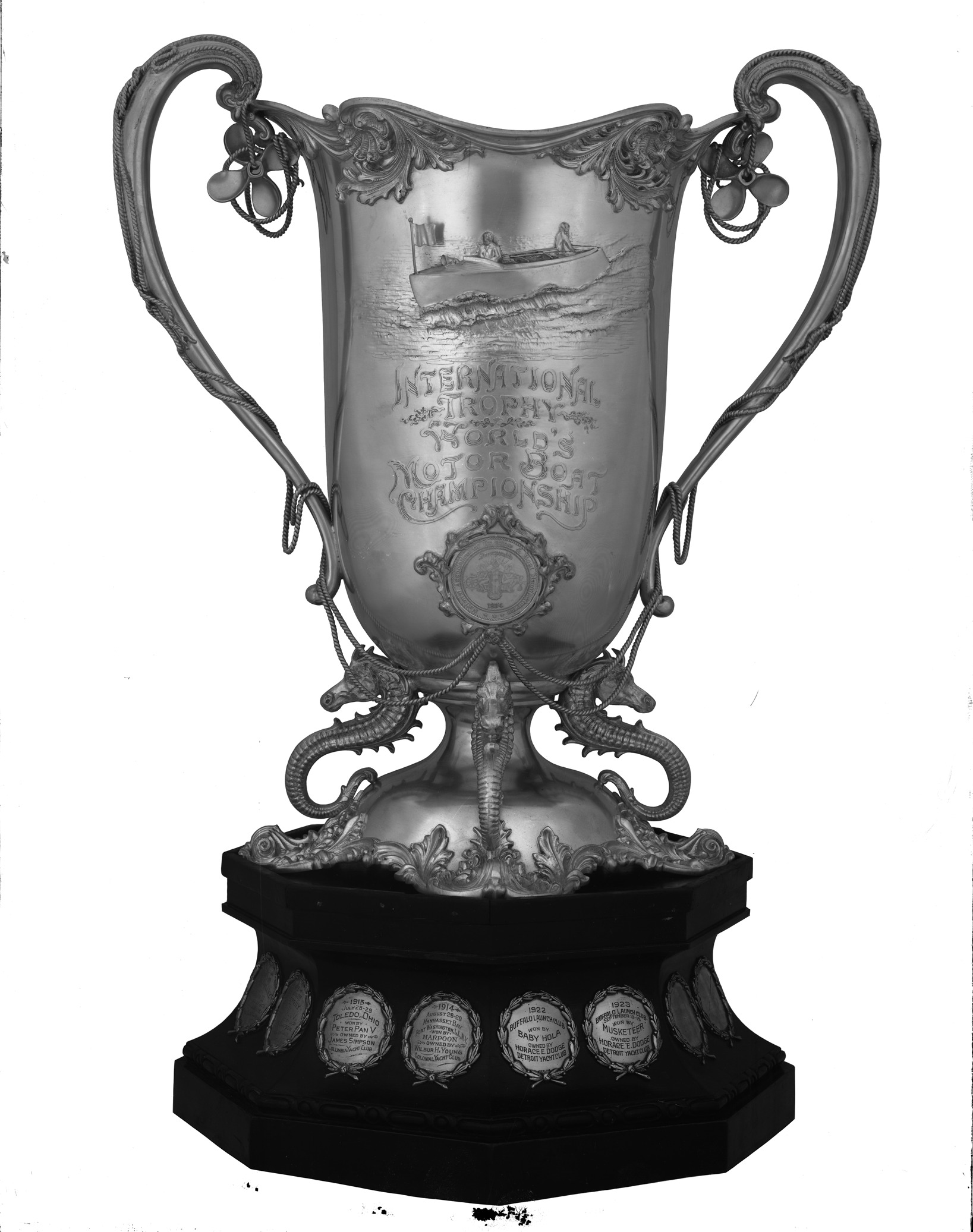 View of two-handled trophy cup decorated with seahorses and propellers; engraving of two men in a racing boat on cup; inscribed on cup: "International trophy, World's Motor Boat Championship." Plaques with names of past winners on base of cup. Recorded in glass negative ledger: "LD/Motor boat racing."