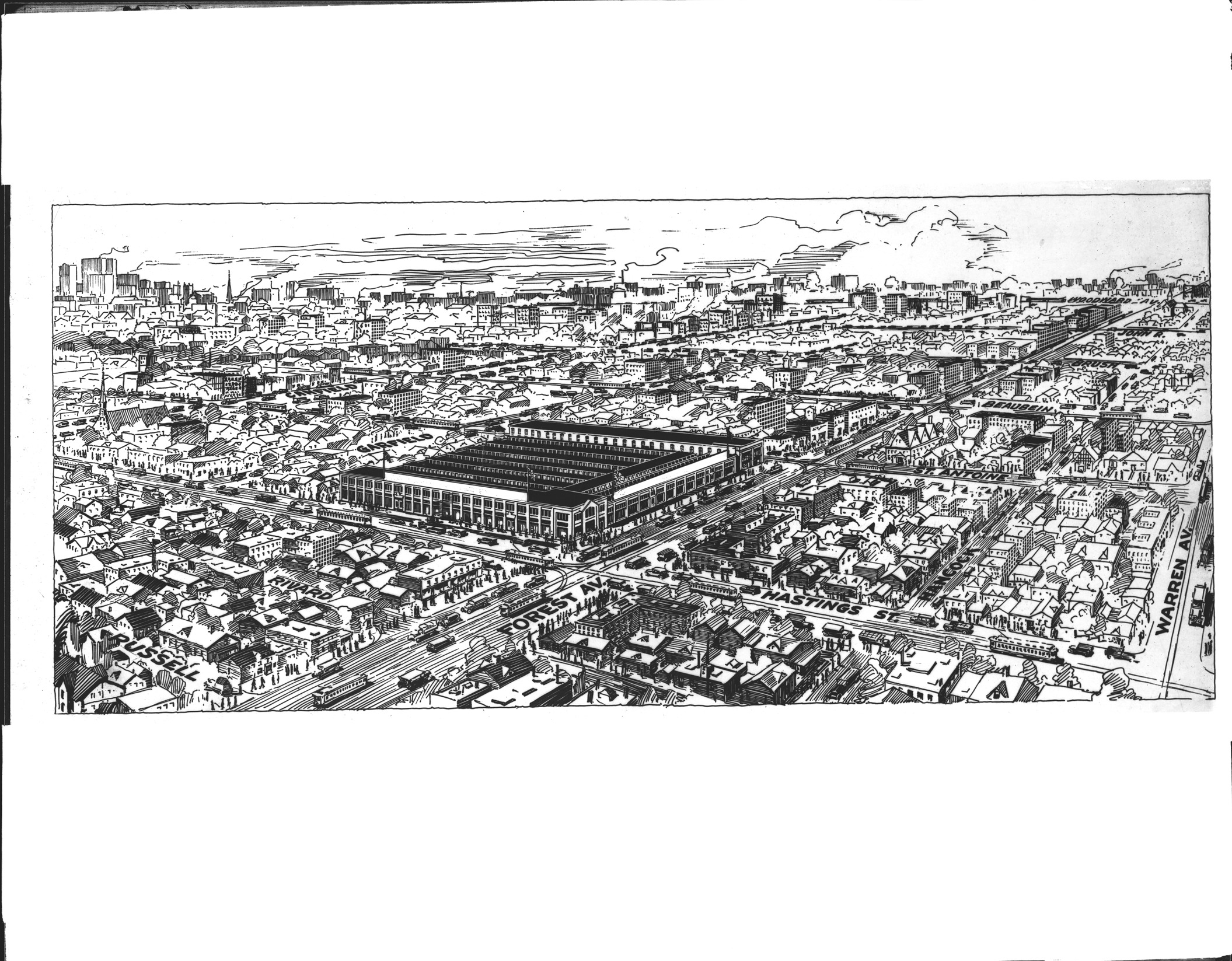Architectural drawing of the east side of Detroit near Forest Avenue and Hastings; drawing shows two-story commercial building at corner. Recorded in glass negative ledger: "D/Streets-Forest."