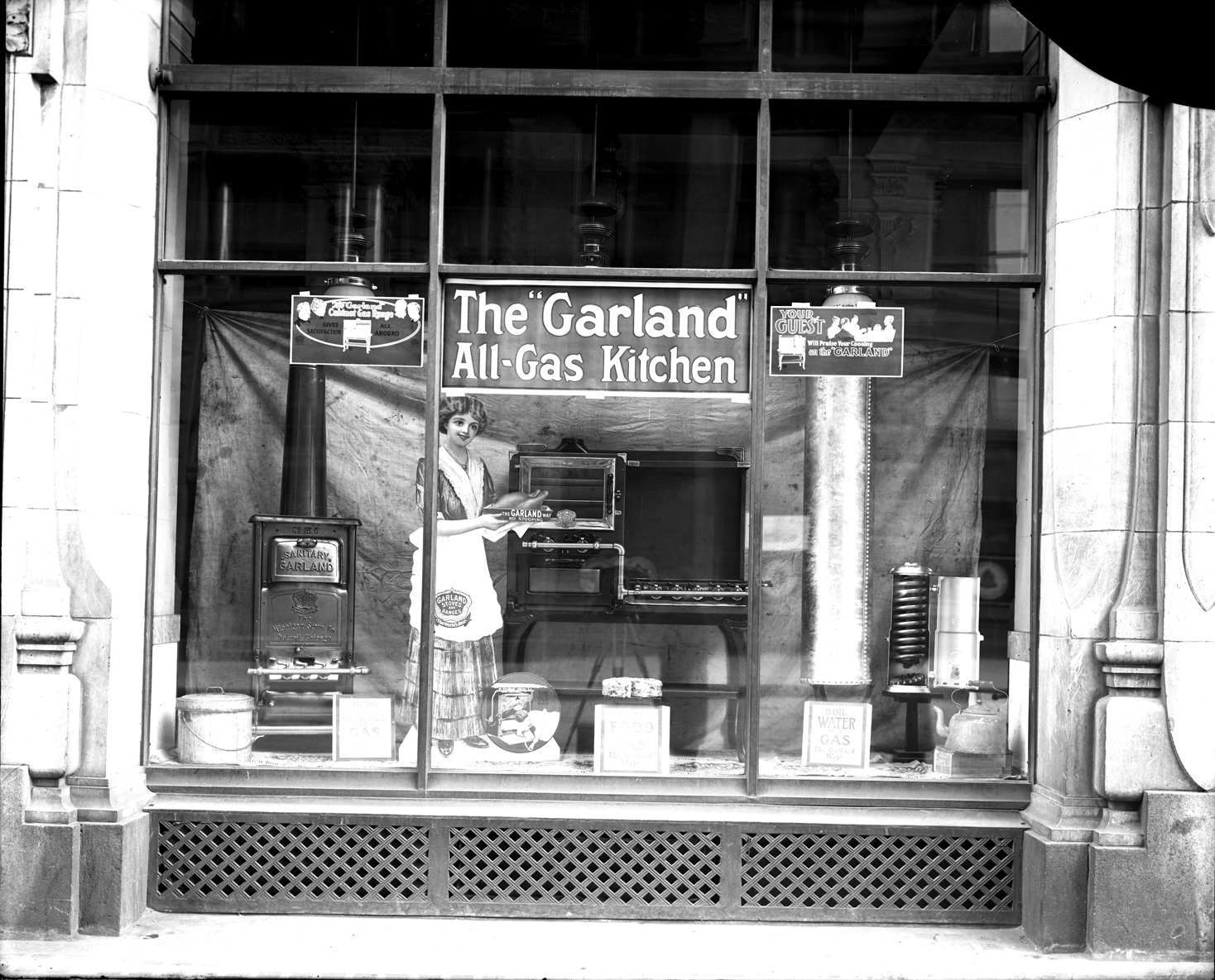 Favorite this☆ Detroit City Gas Company window Description: View of store window display; cardboat cutout of woman wearing apron posing between two Garland stoves; sign in display: "The Garland all-gas kitchen." Recorded in glass negative ledger: "D/Industries & business houses-Detroit City Gas Co." Details Resource ID: EB02g045 Subject: Gas companies--Michigan--Detroit Show windows--Michigan--Detroit Gas appliances--Michigan--Detroit Glass negatives Date Issued: Unknown year Format: 1 negative : glass ; 8 x 10 in. Member of: Burton Historical Collection Negative Number: BHC glass neg. no. 4162 Rights: Physical rights are retained by DPL. Copyright is retained in accordance with U.S. copyright laws.