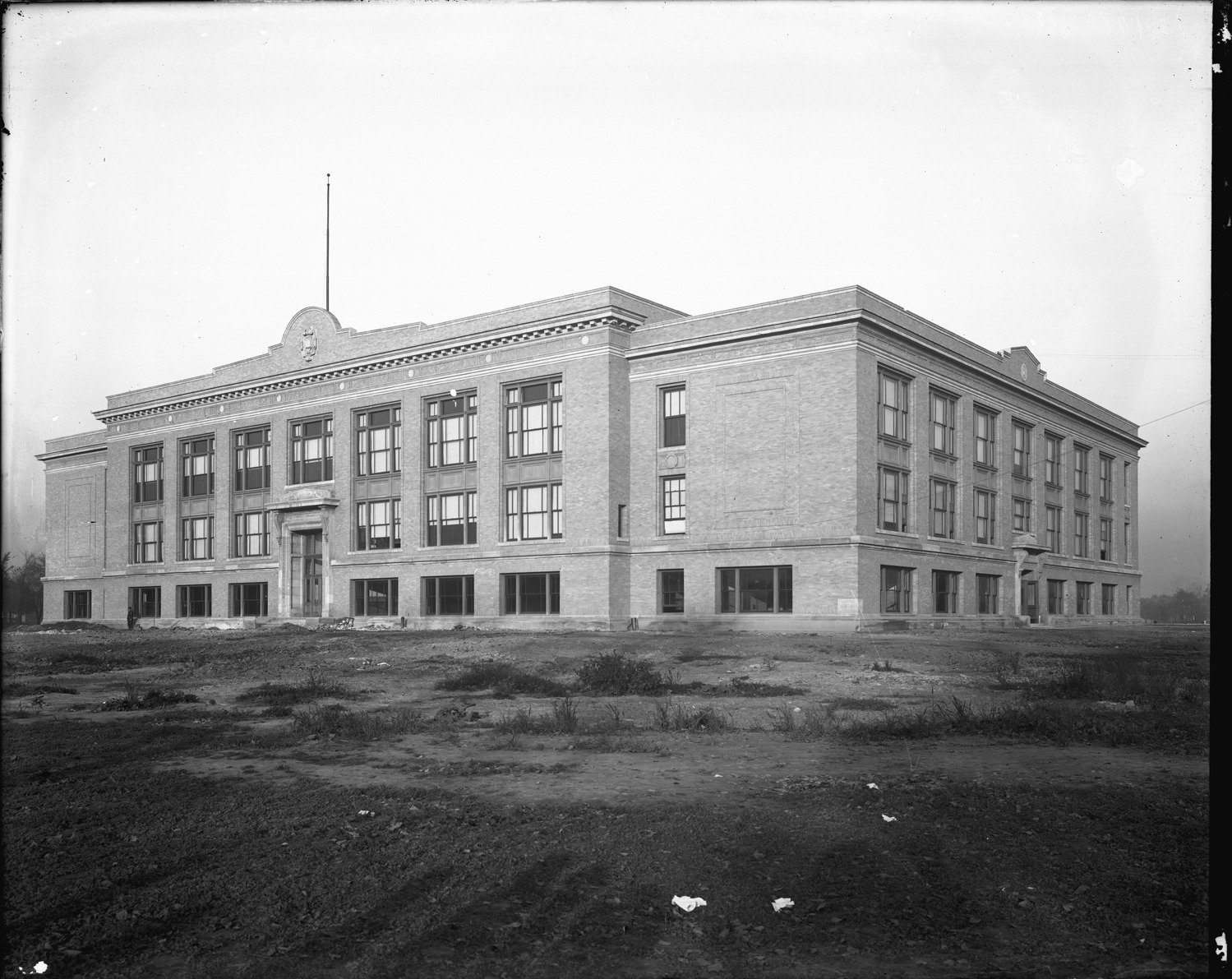 View of Northwestern High School in an open field; three-story brick building with decorative brickwork near roof line; workman stands next to building. Recorded in glass negative ledger: "D/Schools-Northwestern High."