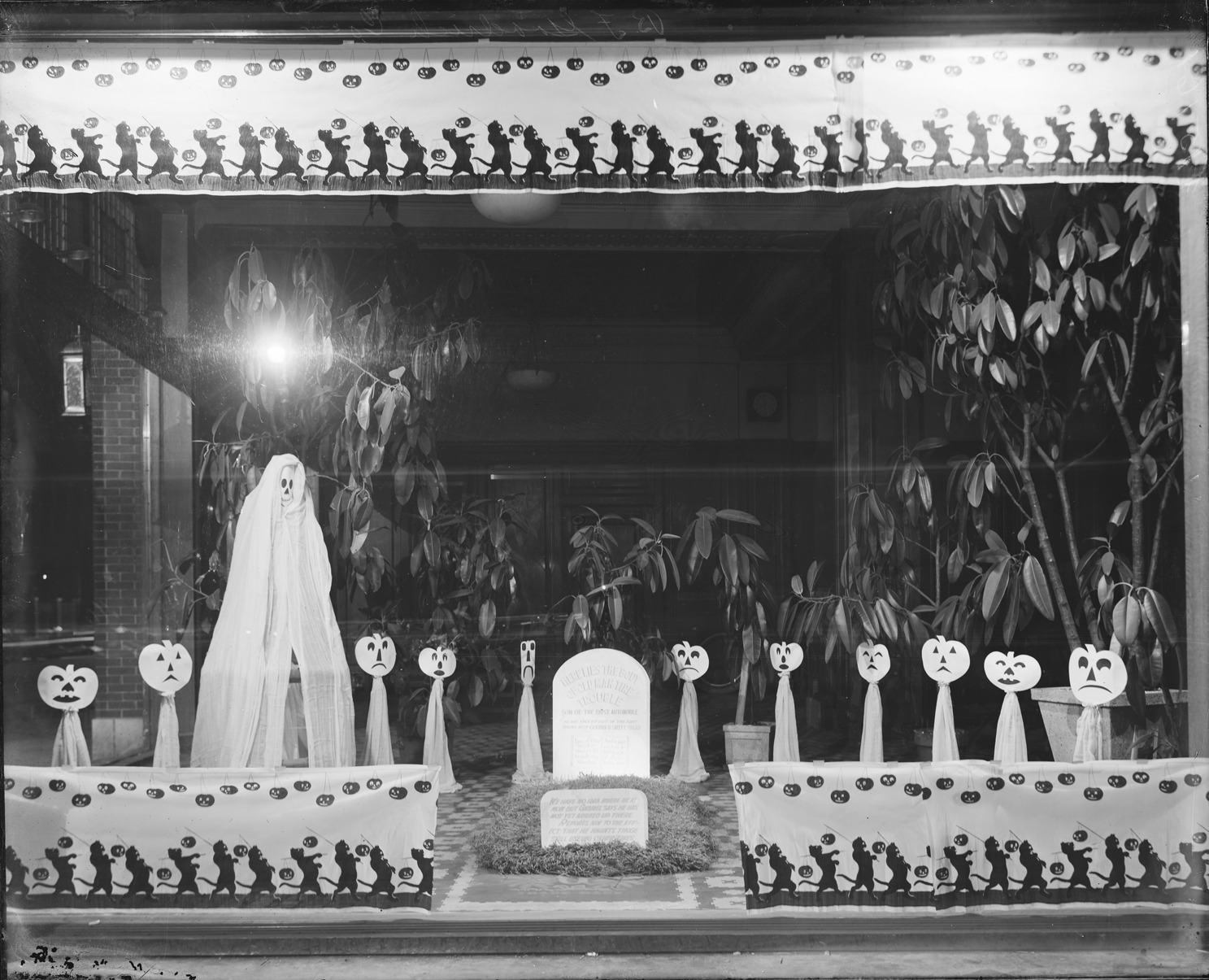 View of Halloween display in store window; decorations of jack-o-lanterns, black cats, ghost and gravestones; written on gravestone: "Here lies the body of old man tire trouble, son of the first automobile; we have no idea where he is now but Gabriel says he has not yet arrived up there. Reports are to the effect that he haunts those still useing [sic] other tires." Recorded in glass negative ledger: "D/Industries & business houses-Goodrich, B.F., Co."
