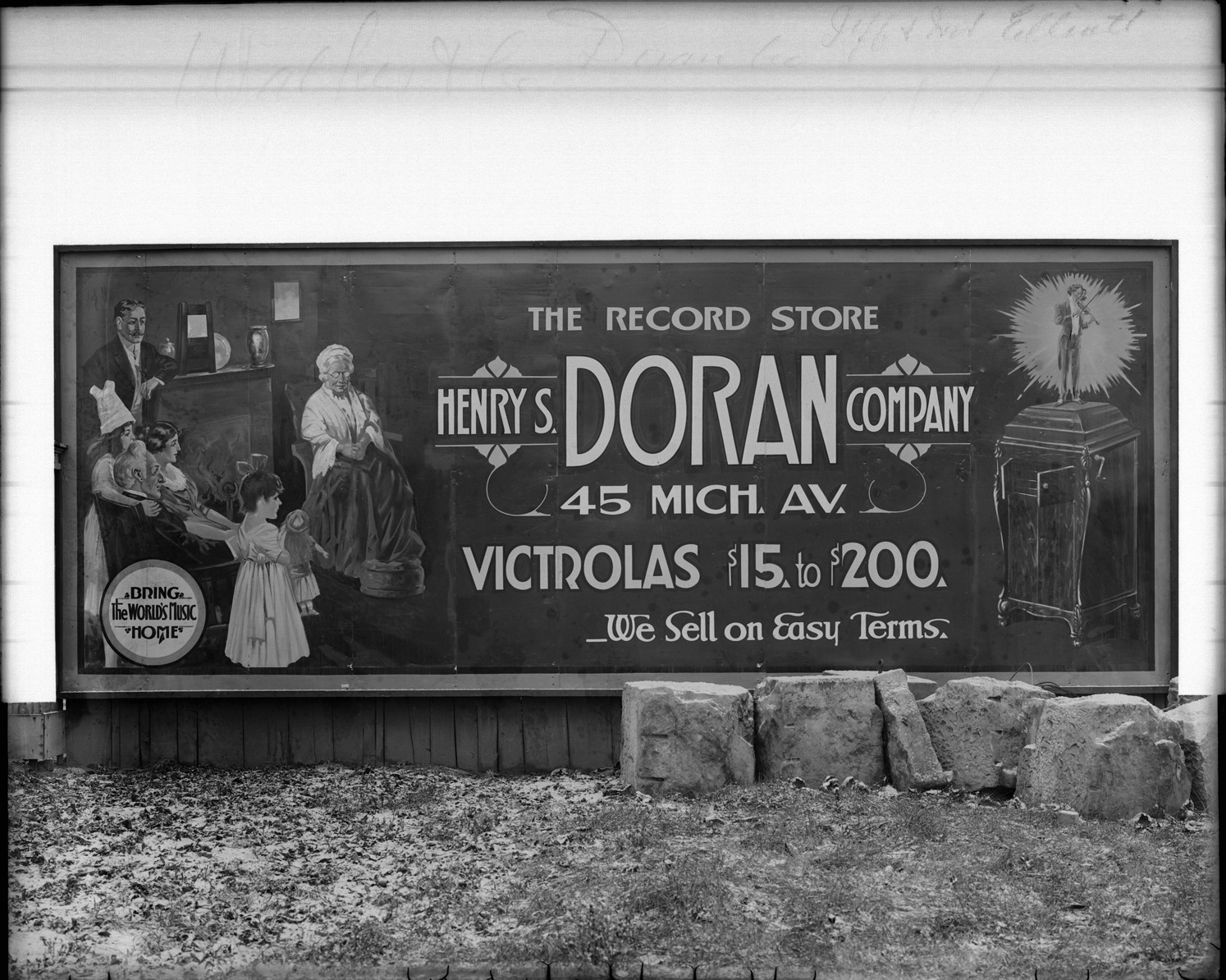 Billboard advertising Henry S. Doran Company; billboard depicts a family listening to a record player or phonograph; on sign: "The record store, Henry S. Doran Company, 45 Mich Av., Victrolas $15 to $200, we sell on easy terms." Recorded in glass negative ledger: "D/Industries & business houses-Doran, Henry S., Co."