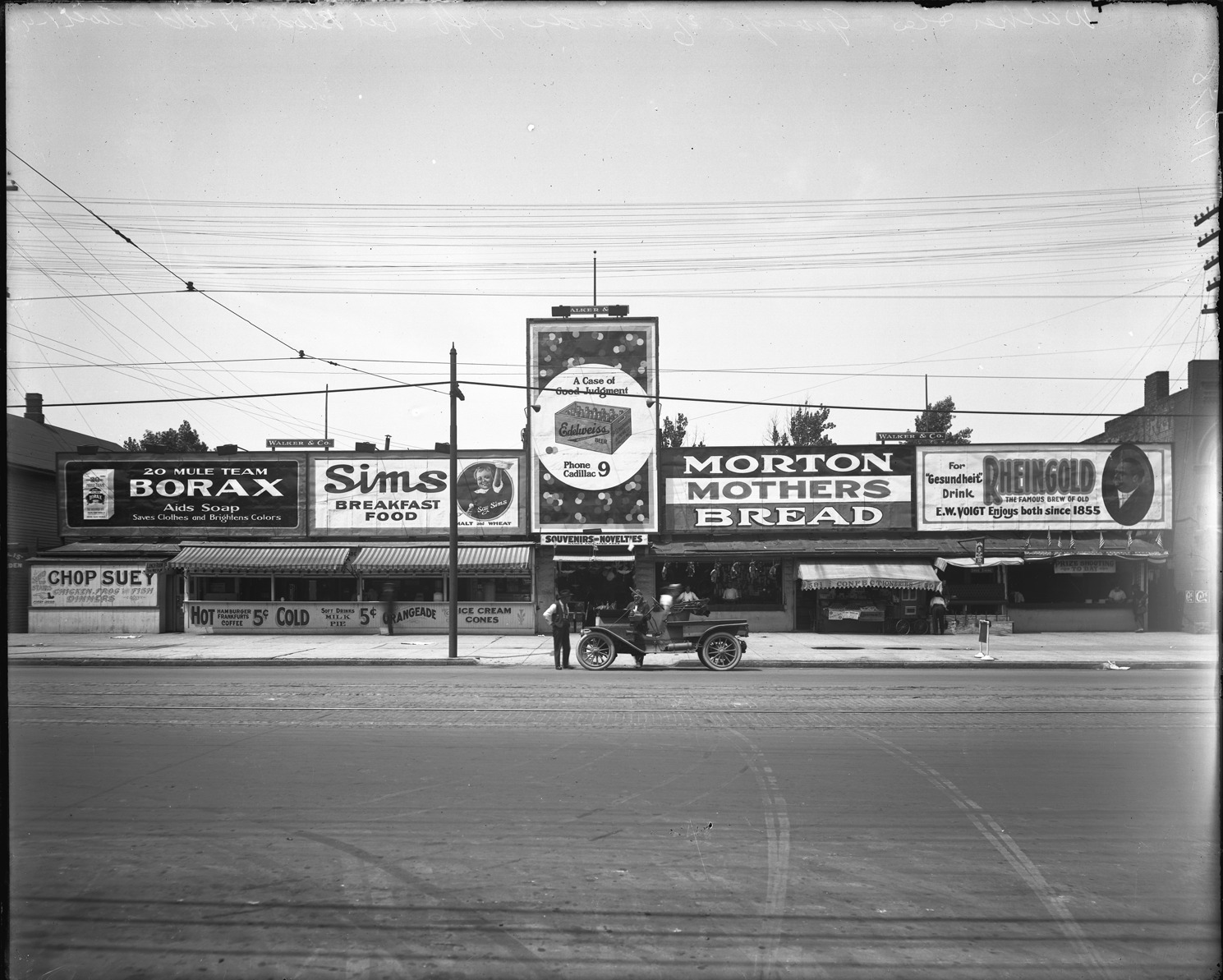 Row of billboards over commercial building; billboards read: "20 Mule Team Borax, aids soap, saves clothes and brightens colors; Sims breakfast food; Edelweiss beer, a case of good judgment; Morton Mothers bread; Rheingold, the famous brew of old, for Gesundheit drink, E.W. Voight enjoys both since 1855." Automobile parked in front of building. Recorded in glass negative ledger: "D/Signs & signboards."