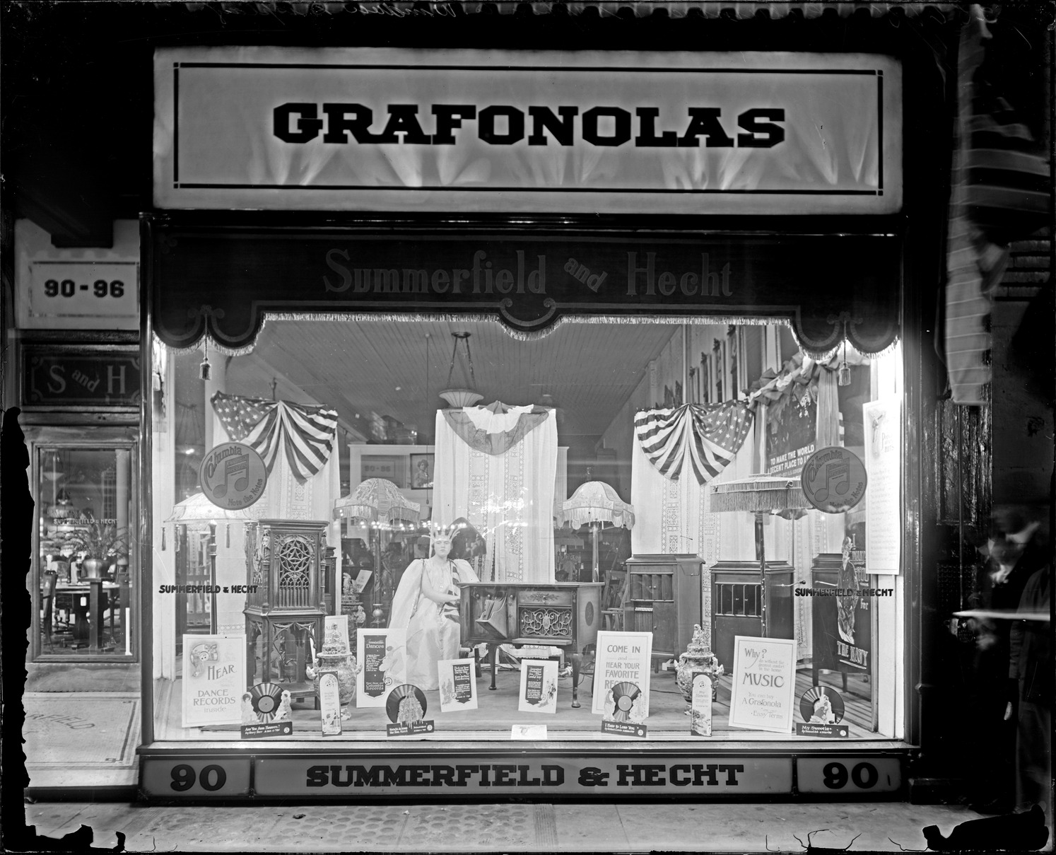 Favorite this☆ Window display at Summerfield and Hecht Description: Window display for Summerfield and Hecht; mannequin of woman dressed as Statue of Liberty; display of phonographs in cabinets; sign over window: "Grafonolas." Recorded in glass negative ledger: "D/Industries & business houses-Summerfield & Hecht." Details Resource ID: EB02g110 Subject: Show windows--Michigan--Detroit Advertising--Phonographs Glass negatives Date Issued: Unknown year Format: 1 negative : glass ; 8 x 10 in. Member of: Burton Historical Collection Negative Number: BHC glass neg. no. 4248 Rights: Physical rights are retained by DPL. Copyright is retained in accordance with U.S. copyright laws.