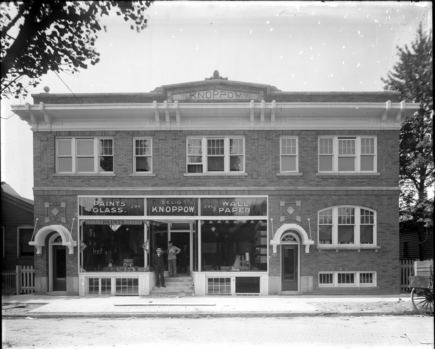 View of two-story brick building with storefront; building has overhanging eaves with decorative brackets in front; three men stand in store entrance; inscribed in stone near building roof: "Knoppow." Painted on store window: "Selig Knoppow, paints, glass, wallpaper." Recorded in glass negative ledger: "D/Industries & business houses-Knoppow."