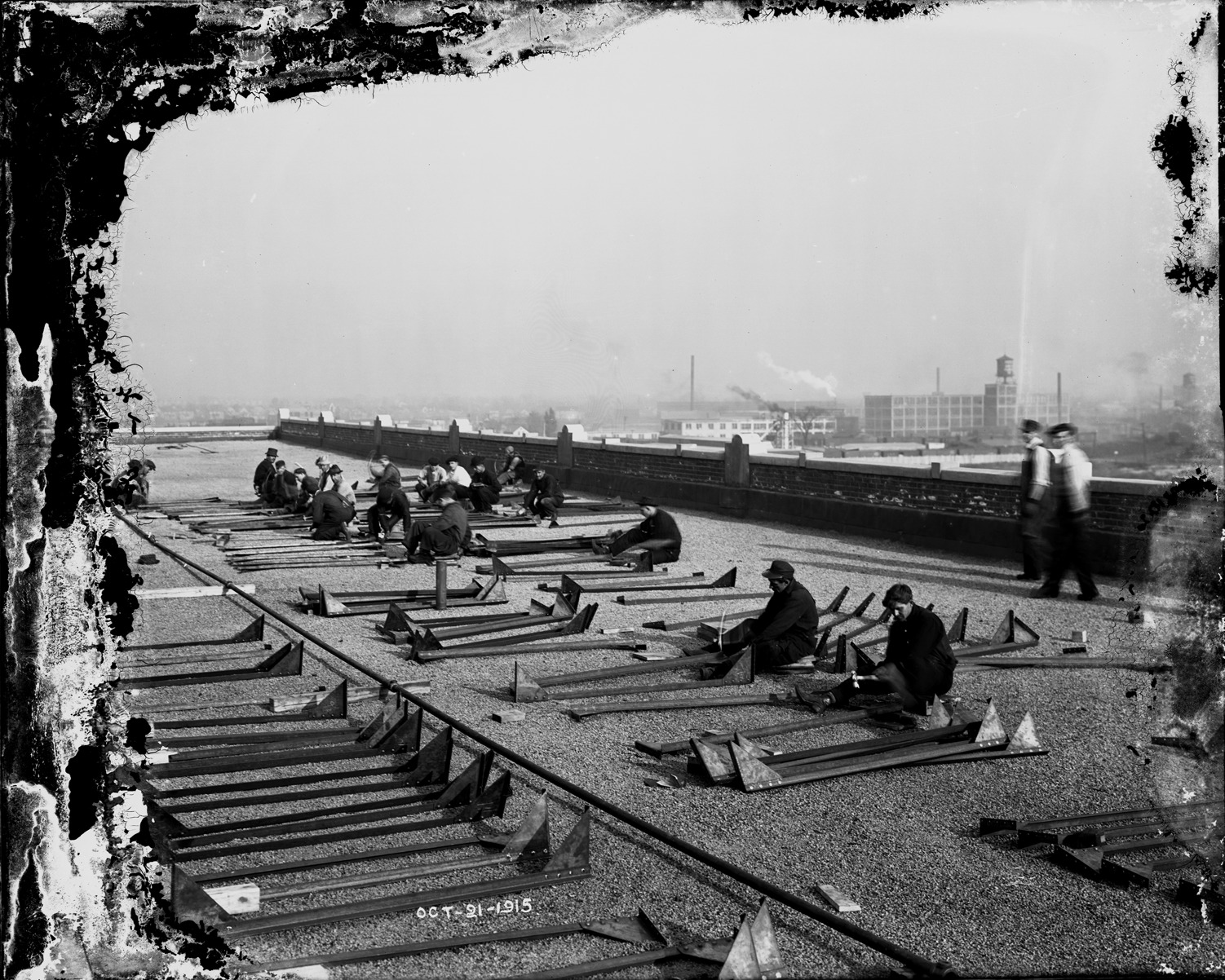 Favorite this☆ Men working on building roof Description: Group of workmen on roof of building, hammering small metal beams or supports. Written on image: "Oct-21-1915." Recorded in glass negative ledger: "D/Industries & business houses." Negative is damaged. Details Resource ID: EB02g146 Subject: Construction workers--Michigan--Detroit Building sites--Michigan--Detroit Glass negatives Date Issued: 1915-10-21 Format: 1 negative : glass ; 8 x 10 in. Member of: Burton Historical Collection Negative Number: BHC glass neg. no. 4286 Rights: Physical rights are retained by DPL. Copyright is retained in accordance with U.S. copyright laws.