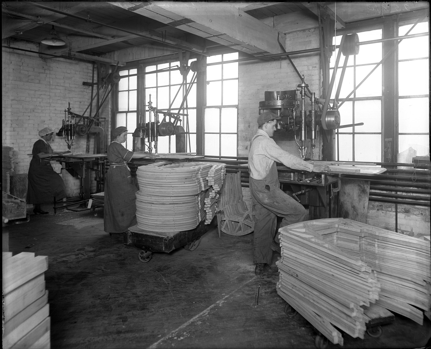 Favorite this☆ J.C. Widman and Company employees Description: Man and two women cutting pieces of wood with machinery in factory; stacks of cut wood on carts. Recorded in glass negative ledger: "D/Industries & business houses-Widman, J.C. & Co." Details Resource ID: EB02g176 Subject: Furniture industry and trade--Michigan--Detroit Furniture industry and trade--Employees Factories--Michigan--Detroit Glass negatives Date Issued: Unknown year Format: 1 negative : glass ; 8 x 10 in. Member of: Burton Historical Collection Negative Number: BHC glass neg. no. 4333 Rights: Physical rights are retained by DPL. Copyright is retained in accordance with U.S. copyright laws.