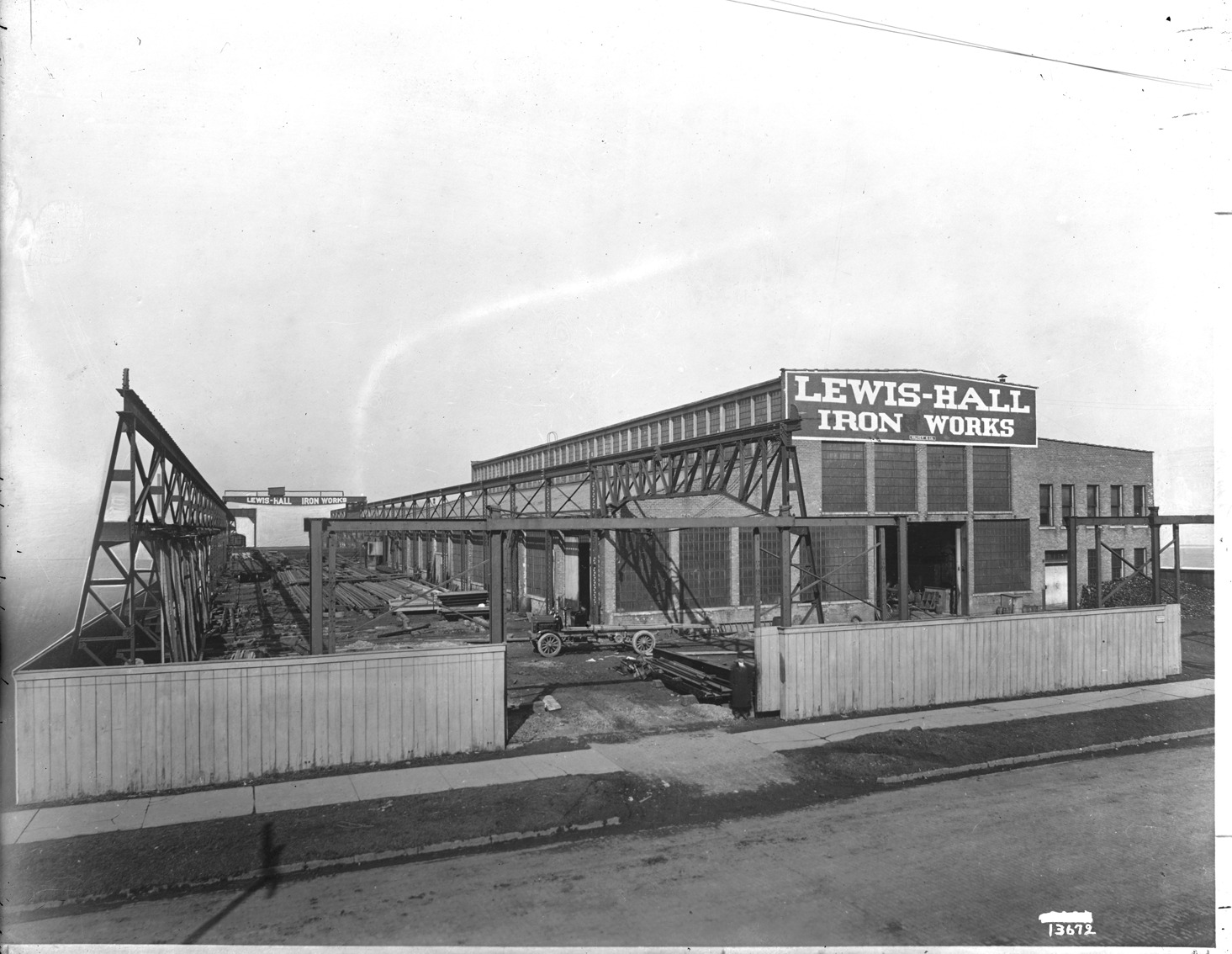 View of brick factory building with adjacent construction site; steel framework of building; steel beams and girders on ground; truck parked on construction site. Sign on building: "Lewis-Hall Iron Works." Recorded in glass negative ledger: "D/Industries & business houses-Lewis-Hall Iron Works."