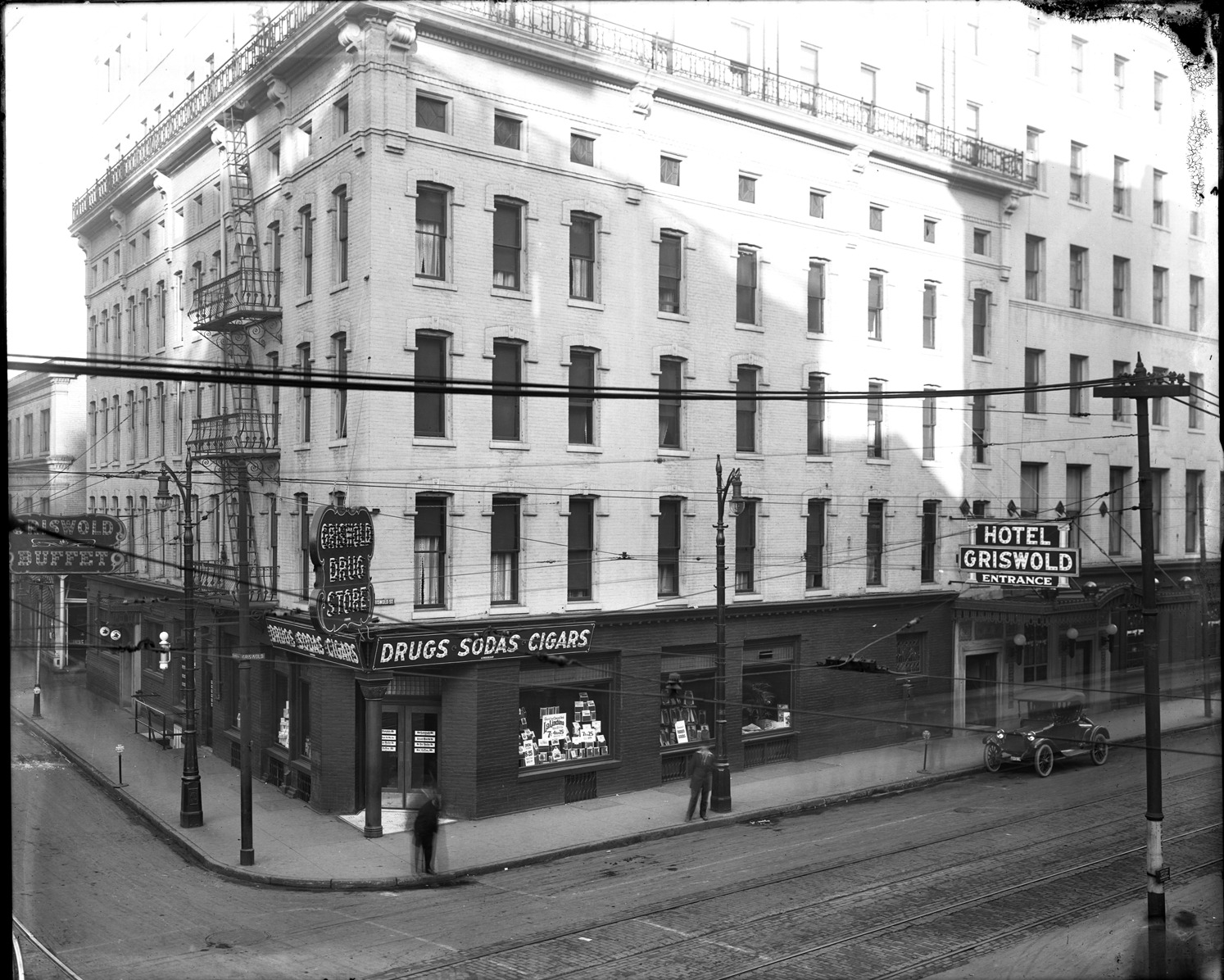 Favorite this☆ Hotel Griswold Description: View of Hotel Griswold; multistory brick building with fire escapes; Griswold Drug Store on corner; automobile parked on street. Recorded in glass negative ledger: "D/Hotels-Griswold." Details Resource ID: EB02g201 Subject: Hotels--Michigan--Detroit Drugstores--Michigan--Detroit Glass negatives Date Issued: Unknown year Format: 1 negative : glass ; 8 x 10 in. Member of: Burton Historical Collection Negative Number: BHC glass neg. no. 4364 Rights: Physical rights are retained by DPL. Copyright is retained in accordance with U.S. copyright laws.