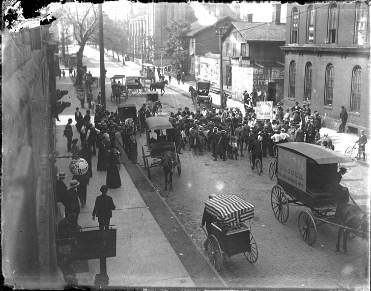 View of Shelby Street; crowd of men and boys gather in street; one man holds sign: "Baseball to-day." Pedestrians on sidewalk; horse-drawn wagons and carriages in street; man pulls cart in foreground. Recorded in glass negative ledger: "D/Streets-Shelby."