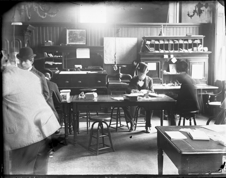 Favorite this☆ Interior of business office Description: Interior of office; men wearing suits and hats examine paperwork at tables; wooden desks against wall. Recorded in glass negative ledger: "D/Interior decoration-Business offices." Details Resource ID: EB02g251 Subject: Offices--Michigan--Detroit Glass negatives Date Issued: Unknown year Format: 1 negative : glass ; 4 x 5 in. Member of: Burton Historical Collection Negative Number: BHC glass neg. no. 4442 Rights: Physical rights are retained by DPL. Copyright is retained in accordance with U.S. copyright laws.