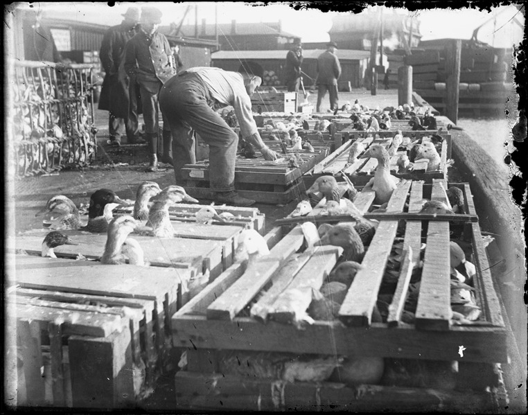 Man stands over wooden crates of live ducks in a dock or loading area; two men stand nearby. Recorded in glass negative ledger: "D/Markets."