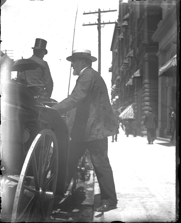 Favorite this☆ Man stepping into horse-drawn carriage Description: View of a man wearing a hat and suit stepping into a horse-drawn carriage at the curb; driver wears a top hat; buildings on right. Recorded in glass negative ledger: "D/Costume-Men." Details Resource ID: EB02g266 Subject: Men--Michigan--Detroit Horse-drawn vehicles--Michigan--Detroit Glass negatives Date Issued: Unknown year Format: 1 negative : glass ; 5 x 4 in. Member of: Burton Historical Collection Negative Number: BHC glass neg. no. 4458 Rights: Physical rights are retained by DPL. Copyright is retained in accordance with U.S. copyright laws.