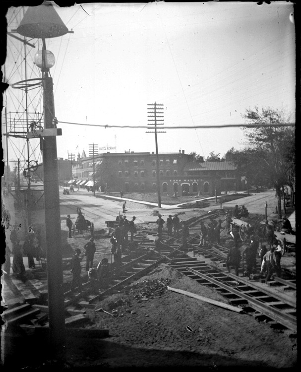 Favorite this☆ Men working on railroad tracks Description: View of men working with tools at intersection of streetcar tracks; Cass Market in background. Recorded in glass negative ledger: "D/Street railways." Details Resource ID: EB02g267 Subject: Street-railroad tracks--Michigan--Detroit Street-railroad tracks--Design and construction Railroad construction workers--Michigan--Detroit Glass negatives Date Issued: Unknown year Format: 1 negative : glass ; 5 x 4 in. Member of: Burton Historical Collection Negative Number: BHC glass neg. no. 4459 Rights: Physical rights are retained by DPL. Copyright is retained in accordance with U.S. copyright laws.