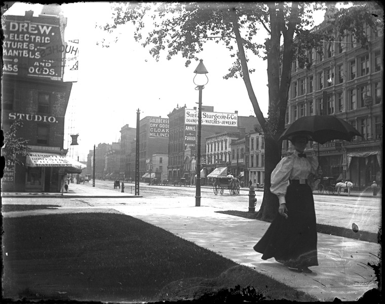 Woman carrying parasol or umbrella walks along Woodward Ave; businesses in background. Recorded in glass negative ledger: "D/Streets-Woodward & Witherell, S.E. cor."