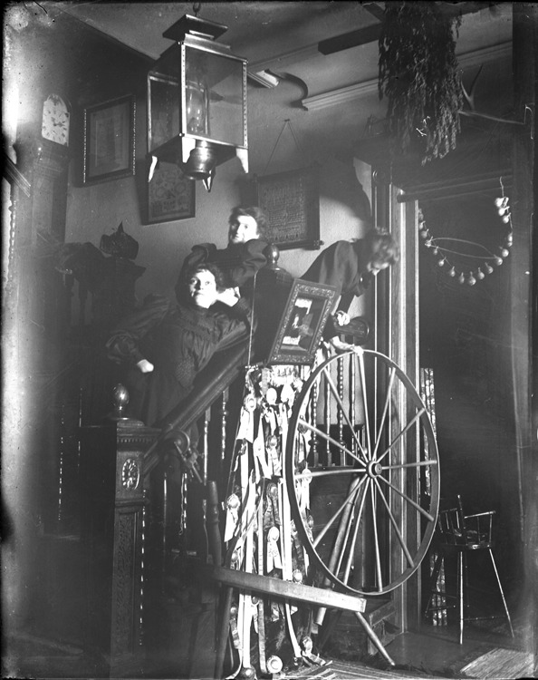 Three women pose in staircase at Palmer Park log cabin; spinning wheel and display of prize ribbons at foot of stairs; grandfather clock at top of staircase. Recorded in glass negative ledger: "D/Parks-Palmer-Log cabin."