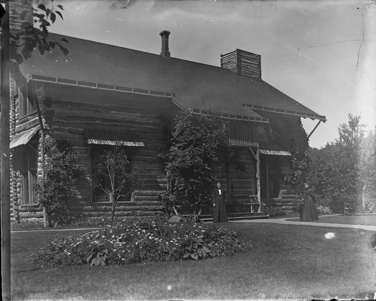 Two women stand in front of two-story log cabin in Palmer Park; circular garden on lawn in front of house. Recorded in glass negative ledger: "D/Parks-Palmer."
