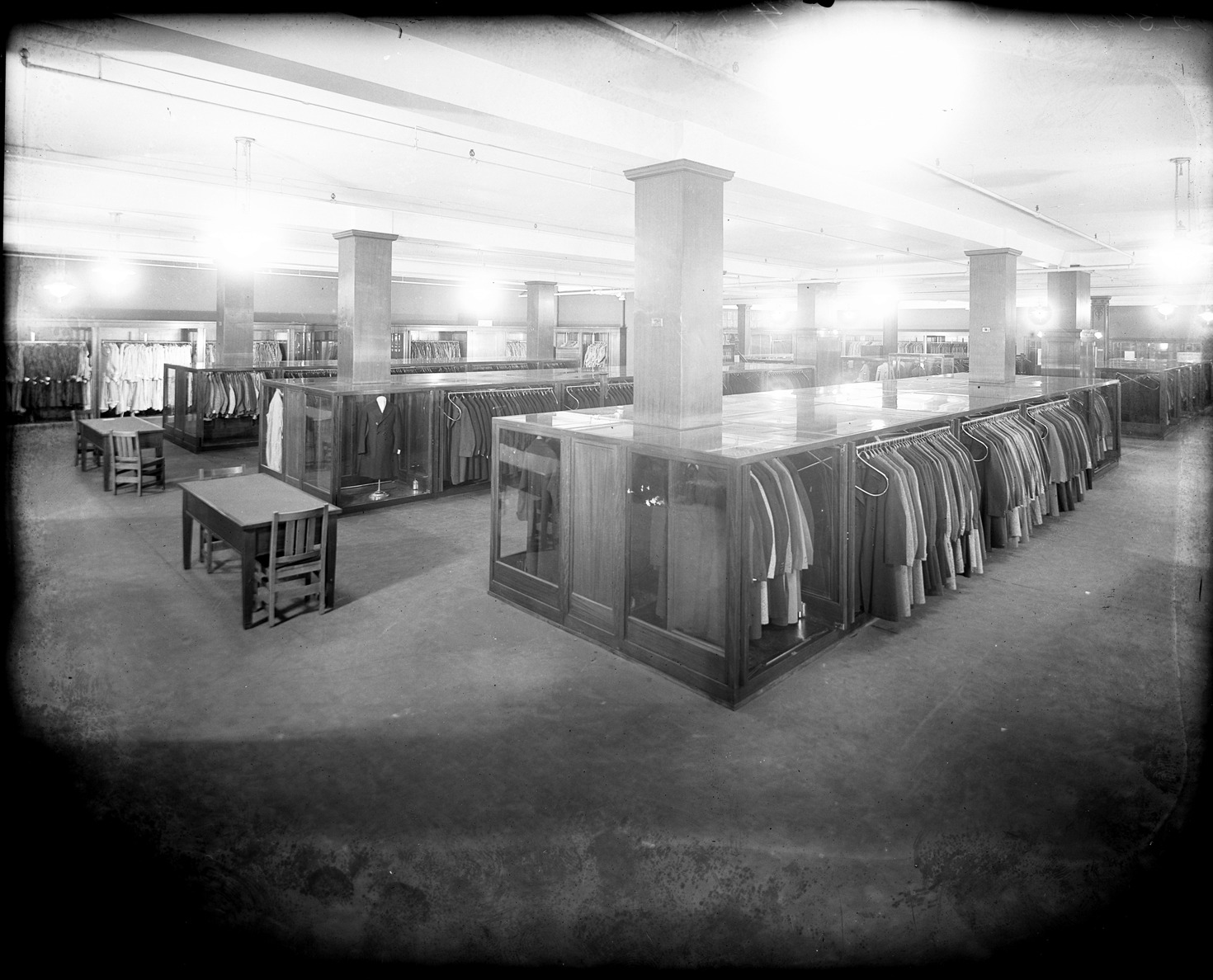 View of interior of men's clothing store; racks of men's overcoats; wooden tables and chairs. Recorded in glass negative ledger: "D/Industries & business houses-S.L. Bird."