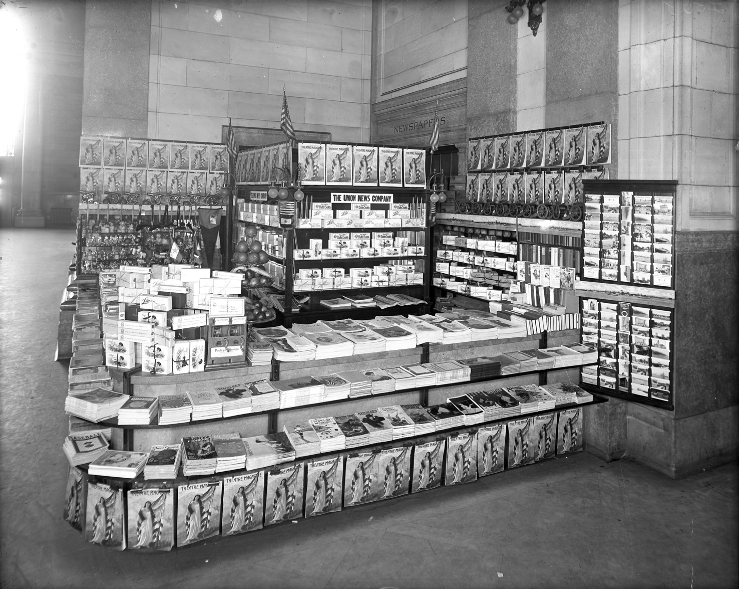 Favorite this☆ Newsstand at Michigan Central Railroad Station Description: View of newsstand at railroad station; magazines, boxes of candy, fruit, figurines, postage stamps and postcards are displayed; sign on shelf: "The Union News Company." Recorded in glass negative ledger: "D/Railroads-M.C.R.R. depot, 1913." Details Resource ID: EB02g343 Subject: Newspaper vendors--Michigan--Detroit Michigan Central Railroad Company Railroad stations--Michigan--Detroit Glass negatives Date Issued: 1913 Format: 1 negative : glass ; 8 x 10 in. Member of: Burton Historical Collection Negative Number: BHC glass neg. no. 4545 Rights: Physical rights are retained by DPL. Copyright is retained in accordance with U.S. copyright laws.
