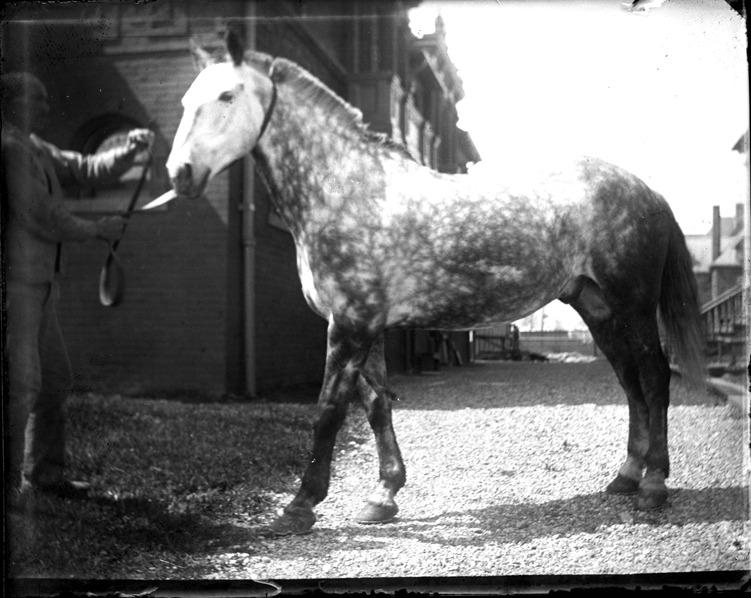 Favorite this☆ Handler with horse at Grosse Pointe Race Track Description: View of horse at Grosse Pointe Race Track; man controls horse with rope; stable in background. Recorded in glass negative ledger: "D/Horse racing." Details Resource ID: EB02g375 Subject: Harness racehorses--Michigan--Grosse Pointe Stables--Michigan--Grosse Pointe Grooms (Horsemanship)--Michigan--Grosse Pointe Racetracks (Horse racing)--Michigan--Grosse Pointe Glass negatives Date Issued: Unknown year Format: 1 negative : glass ; 4 x 5 in. Member of: Burton Historical Collection Negative Number: BHC glass neg. no. 4579 Rights: Physical rights are retained by DPL. Copyright is retained in accordance with U.S. copyright laws.