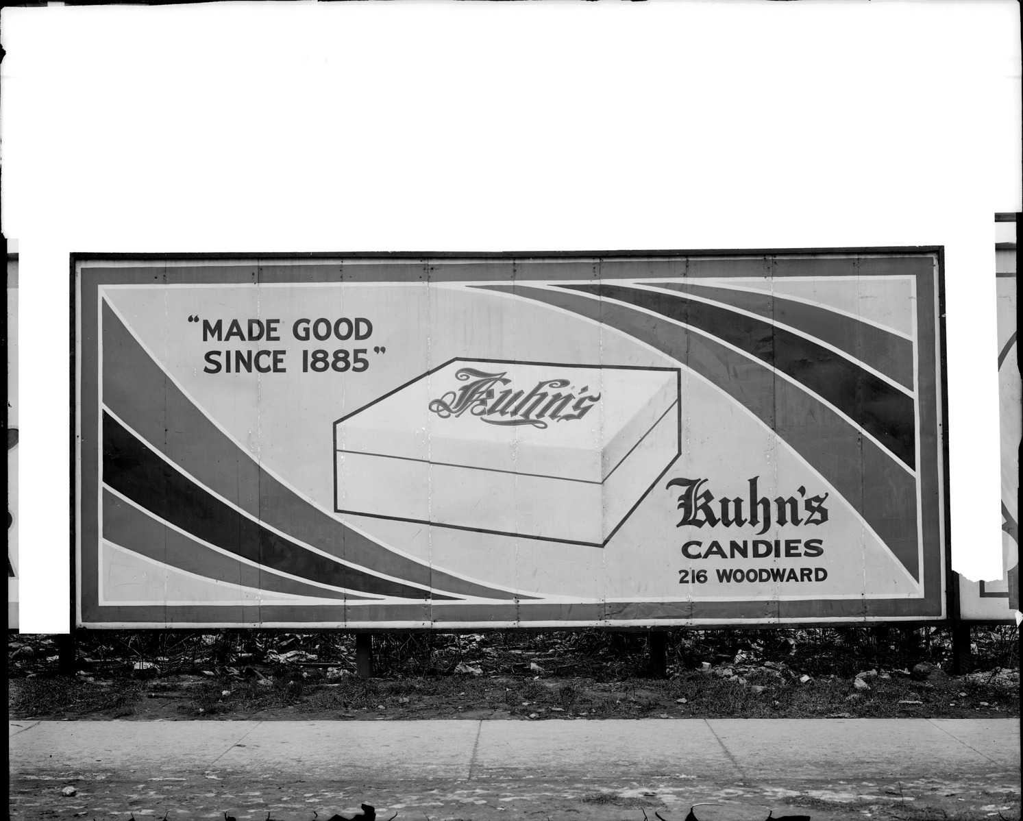 Favorite this☆ Advertising billboard Description: View of billboard advertising Kuhn's candies; billboard depicts box of candy; billboard reads: "Kuhn's candies, 216 Woodward, made good since 1885." Recorded in glass negative ledger: "D/Industries & business houses-Kuhn's." Details Resource ID: EB02g413 Subject: Billboards--Michigan--Detroit Advertising--Confectionery Glass negatives Date Issued: Unknown year Format: 1 negative : glass ; 8 x 10 in. Member of: Burton Historical Collection Negative Number: BHC glass neg. no. 4637 Rights: Physical rights are retained by DPL. Copyright is retained in accordance with U.S. copyright laws.