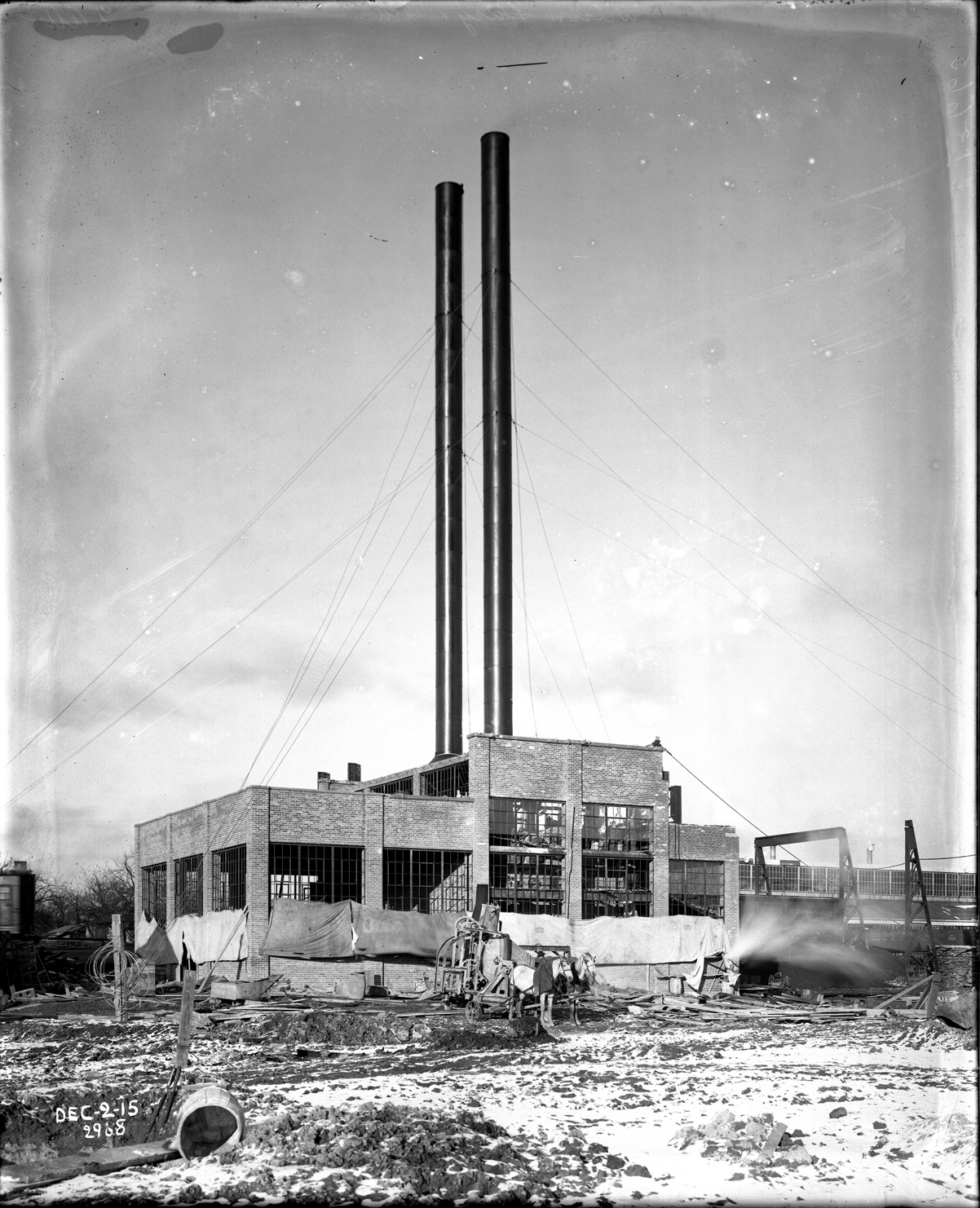 View of brick and glass factory building under construction; building has two smokestacks; team of two horses pulls machinery on wagon; lumber and other construction materials on ground; walls partially draped with tarps. Printed on image: "Dec-2-1915." Recorded in glass negative ledger: "D/Industries & business houses."