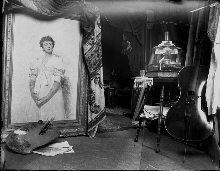 View of framed portrait of woman wearing long gloves; palette and brushes displayed in front of painting; cello rests on floor next to birdcage on table. Recorded in glass negative ledger: "D/Interior decoration."