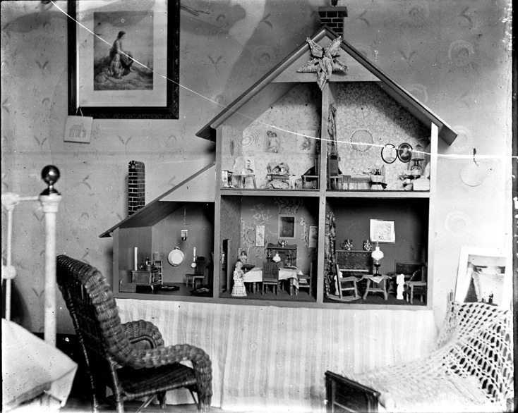View of dollhouse in child's bedroom; dollhouse has chimneys, gabled roof and rooms with miniature furniture; wicker chair in front of dollhouse; corner of bed visible at left. Recorded in glass negative ledger: "D/Doll house." Negative is cracked.