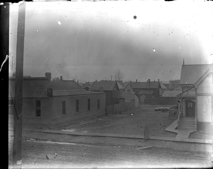 View of empty lot between wooden-frame house and commercial building in neighborhood; plank sidewalk and dirt road in foreground; houses in background. Recorded in glass negative ledger: "D/Streets."