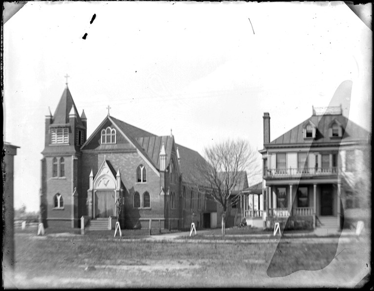 View of the All Saints Catholic Church; next door is two-story wooden-frame house with hipped roof and covered entry porch. Recorded in glass negative ledger: "D/Churches." Discoloration on negative.
