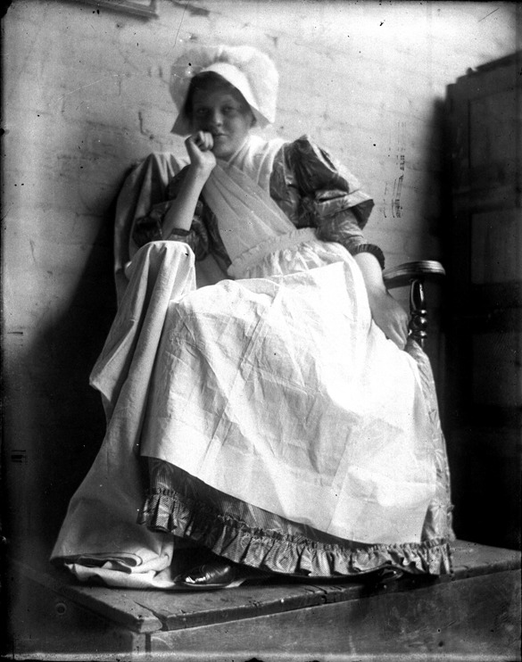 View of seated woman wearing a cap and long ruffled dress with apron. Recorded in glass negative ledger: "D/Schools-Art and theater."